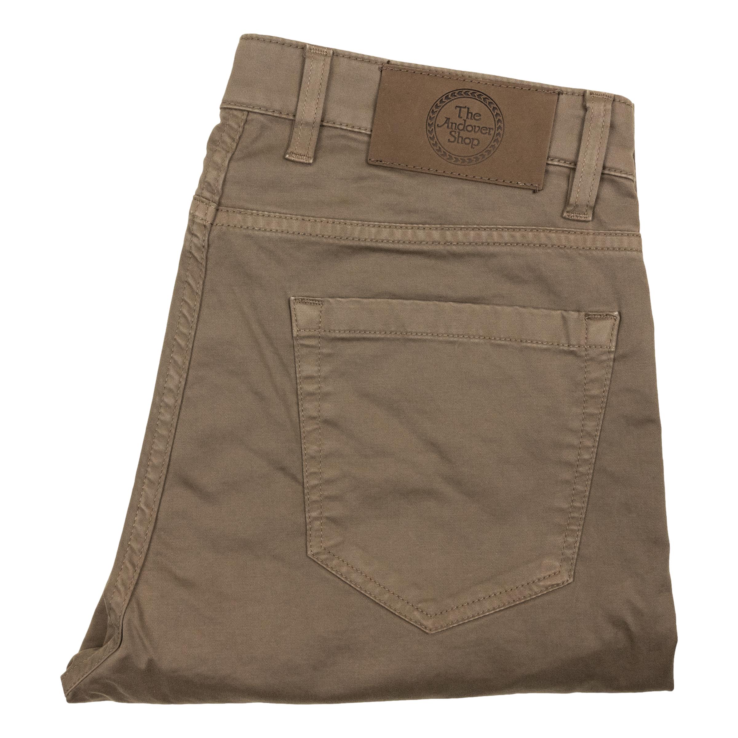 The modern fit, tapered leg chino trousers feature a low waist, button and zip closure with 5 pockets and stretch design. The high quality and design allow for maximum comfort and mobility making them the ideal trousers to wear for daytime activities or nighttime outings. These trousers are made from a premium soft feel cotton chino that consists of 98% premium Italian twill cashmere feel cotton and 2% elastane, creating the perfect slight stretch for maximum comfort and wear. You'll never want to wear any other pair of chinos. Made in Italy for The Andover Shop. Modern fit, tapered leg, soft-touch hand dyed.