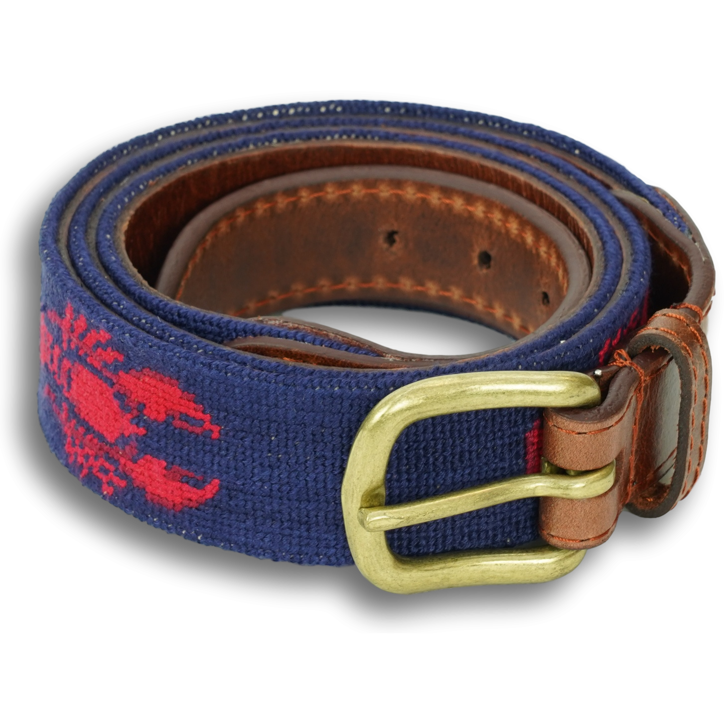 This lobster needlepoint belt, as elegant as it is casual and fun, is the perfect accessory to help you stand apart from the crowd. This hand-stitched traditional belt is 1.25"" in width and is finished with full grain, vegetable tanned Italian leather and a solid brass buckle.