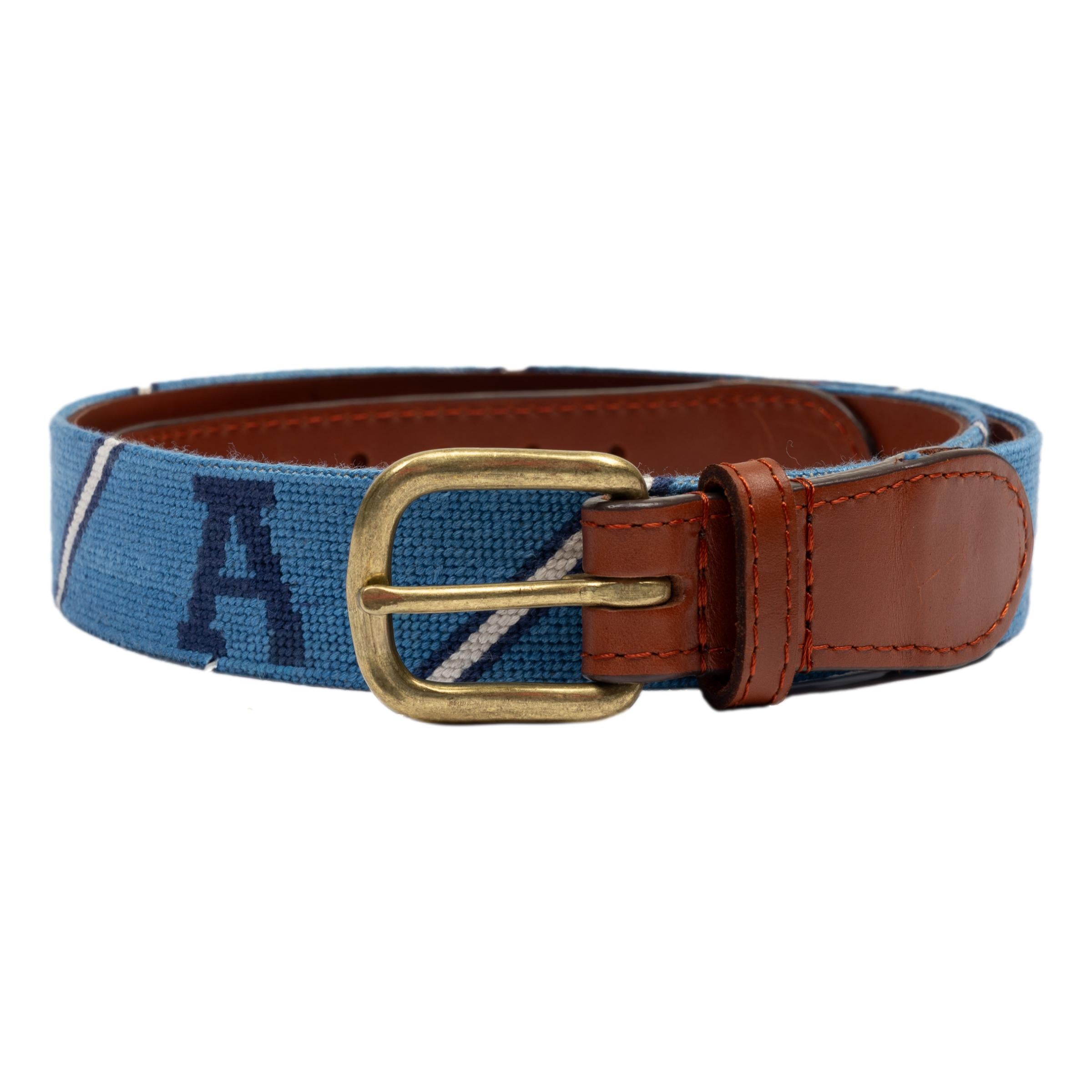 This hand-stitched traditional needlepoint belt is 1.25" in width and is finished with full grain, vegetable tanned Italian leather and a solid brass buckle.