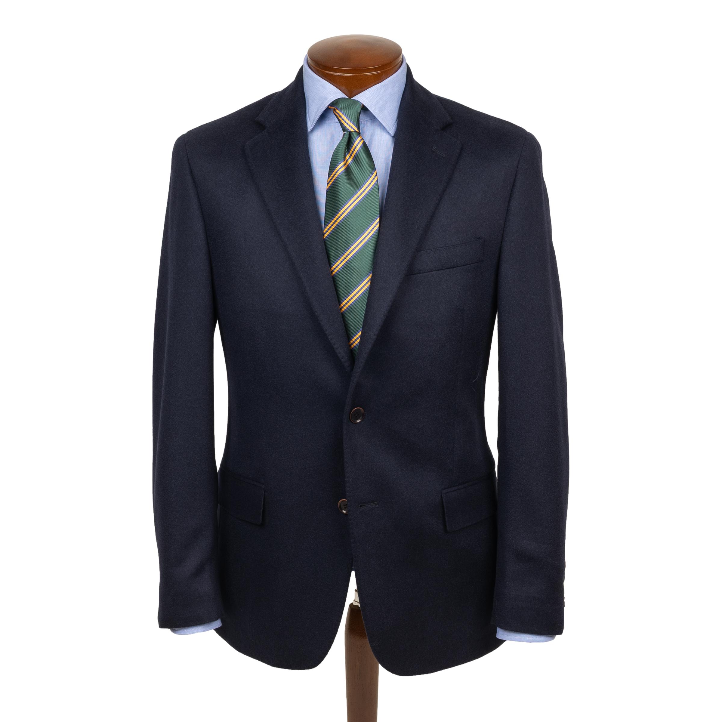 This Navy Cashmere Sport Coat is tailored from 100% cashmere woven in Italy. An elegant jacket for the fall with a three-quarter lining, it offers easy layering during the cooler fall days through the winter. Perfect for office wear or dinner party events. Finished with side vents and classic flap pockets.