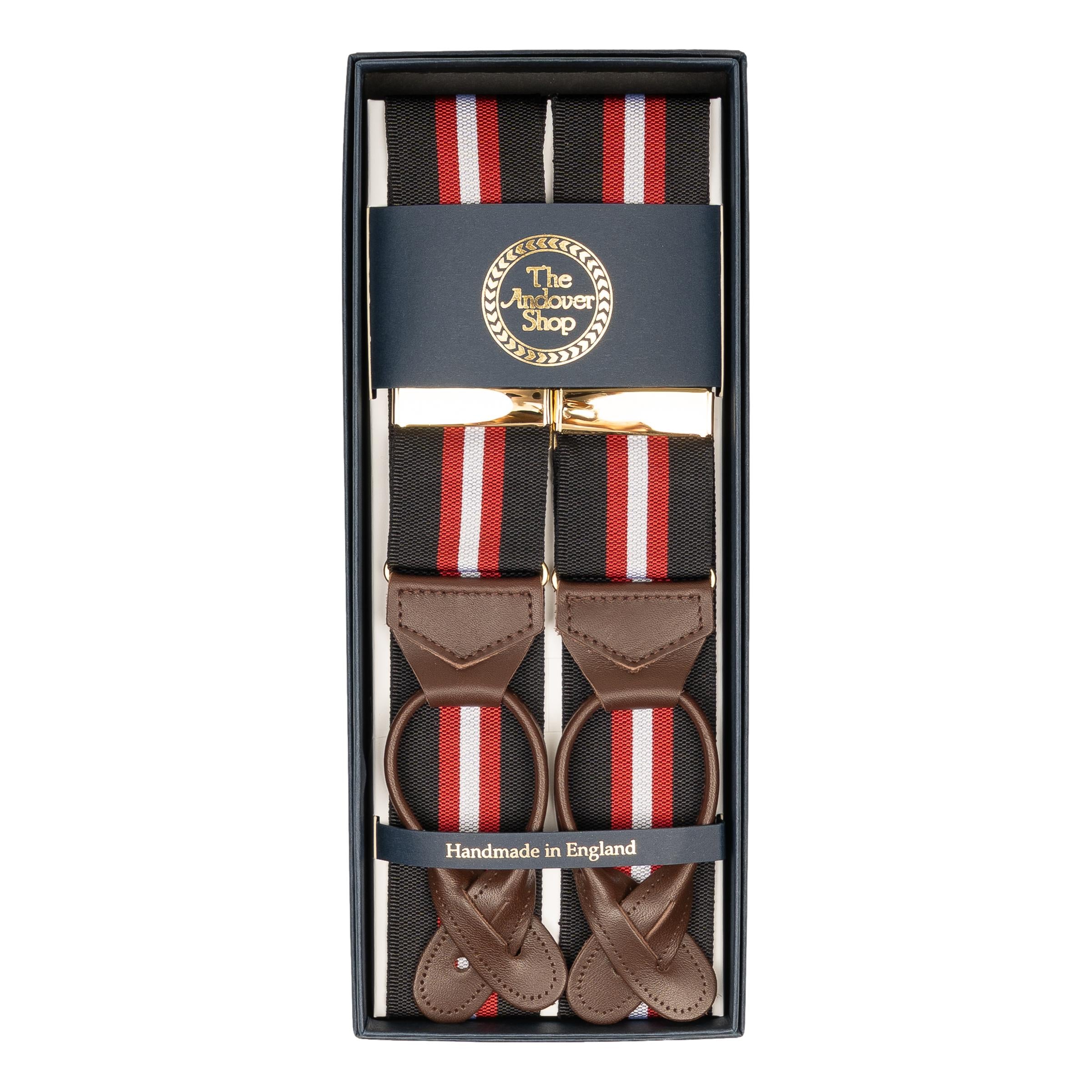 40 mm wide braces. Magenta and green striped rigid barathea. Handmade in England for The Andover Shop.