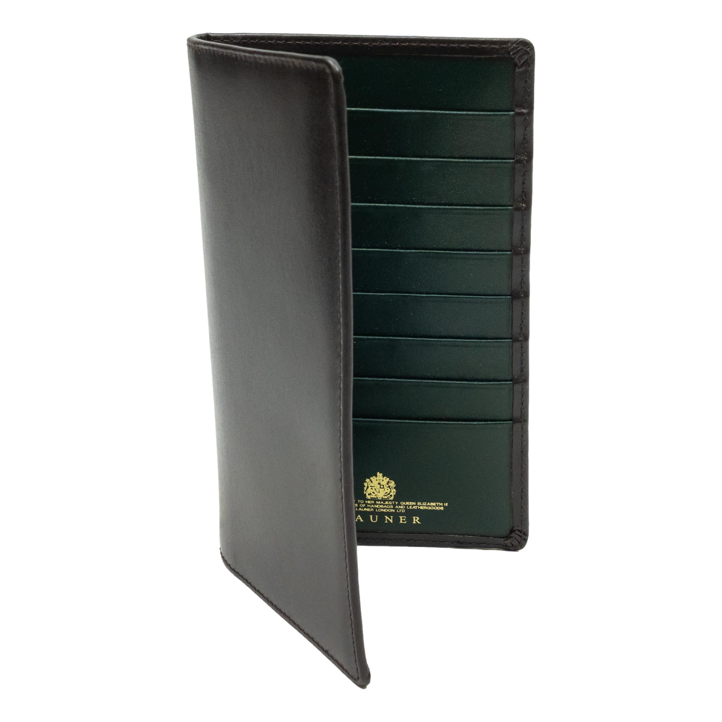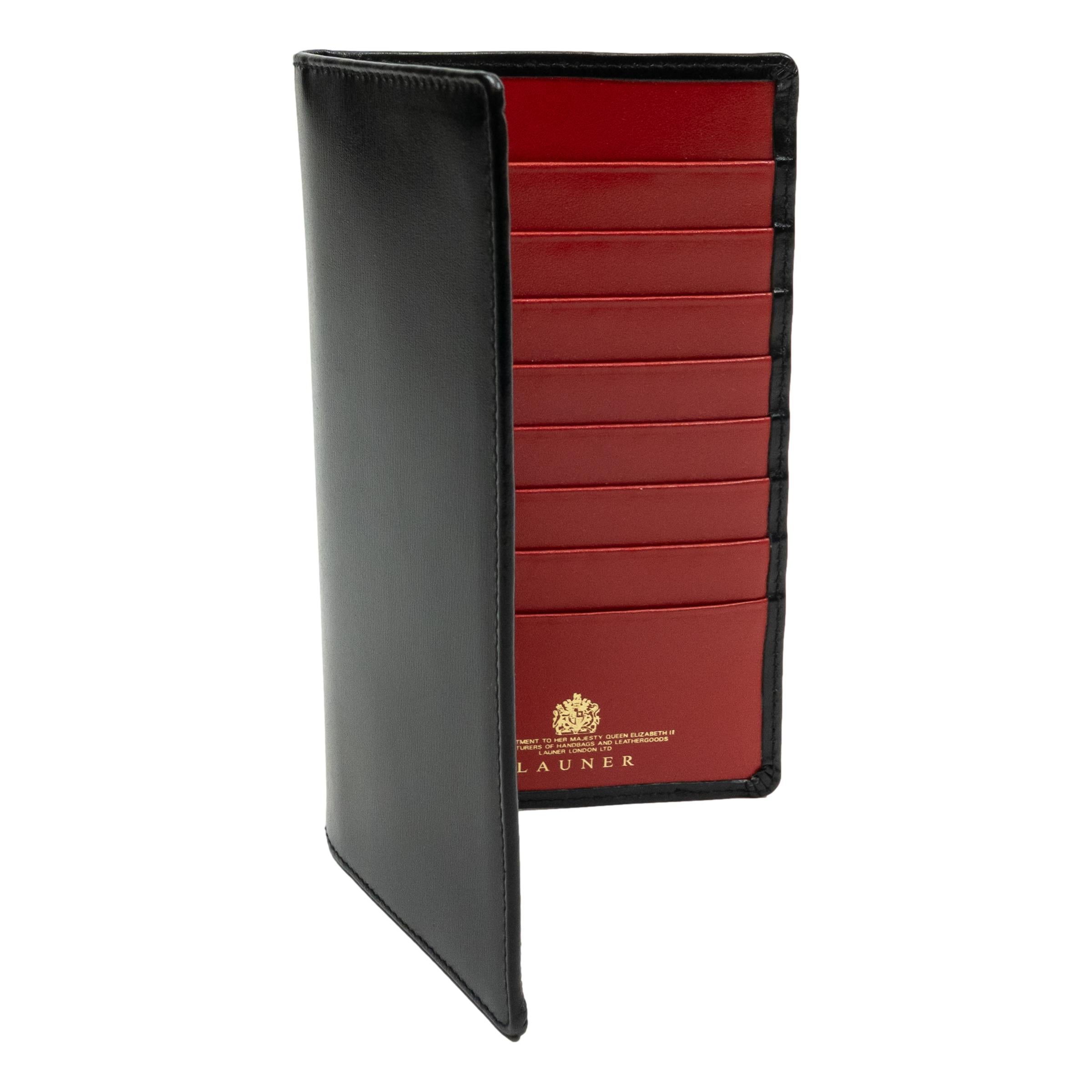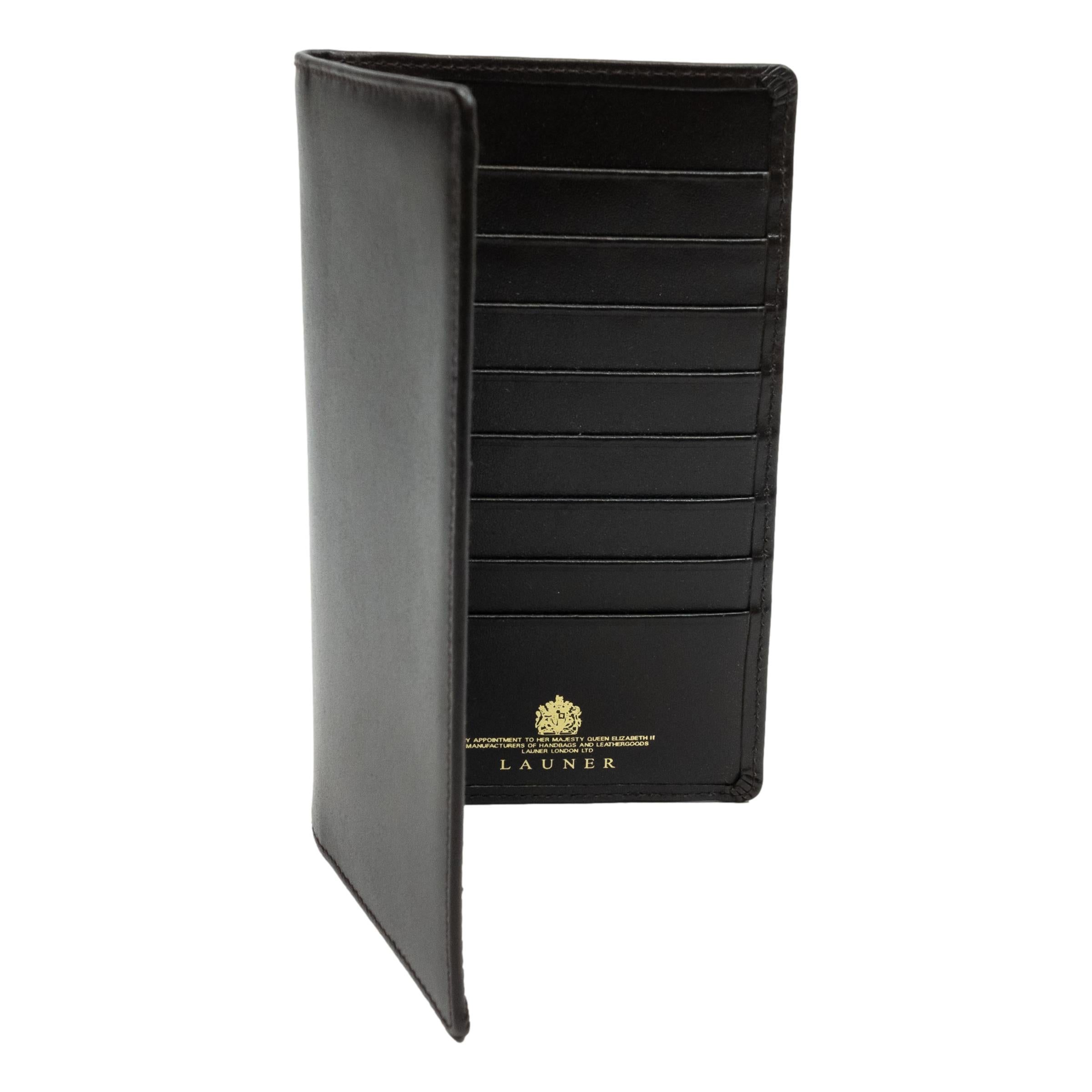 This innovation on Launer’s classic breast pocket wallet rotates the eight card sleeves to allow the inclusion of additional currency sections and a gusseted banknote pocket.
