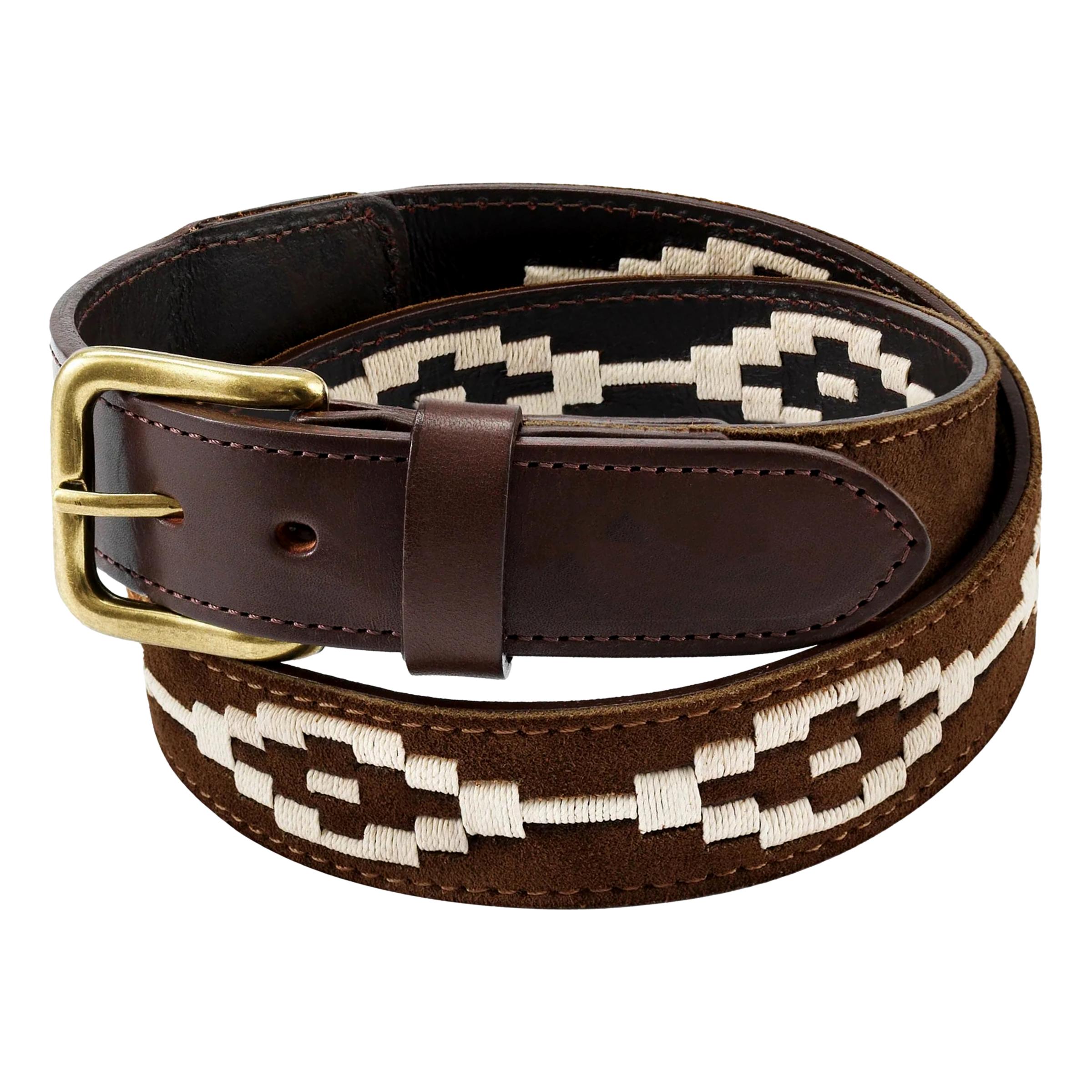 Embody the spirit of South American adventure with the premium brown suede and leather Confianza pampeano belt. The timeless color combination of the sumptuously soft suede in brown and the intricate hand stitched saddlery thread in cream is a traditional design which can never go out of style.