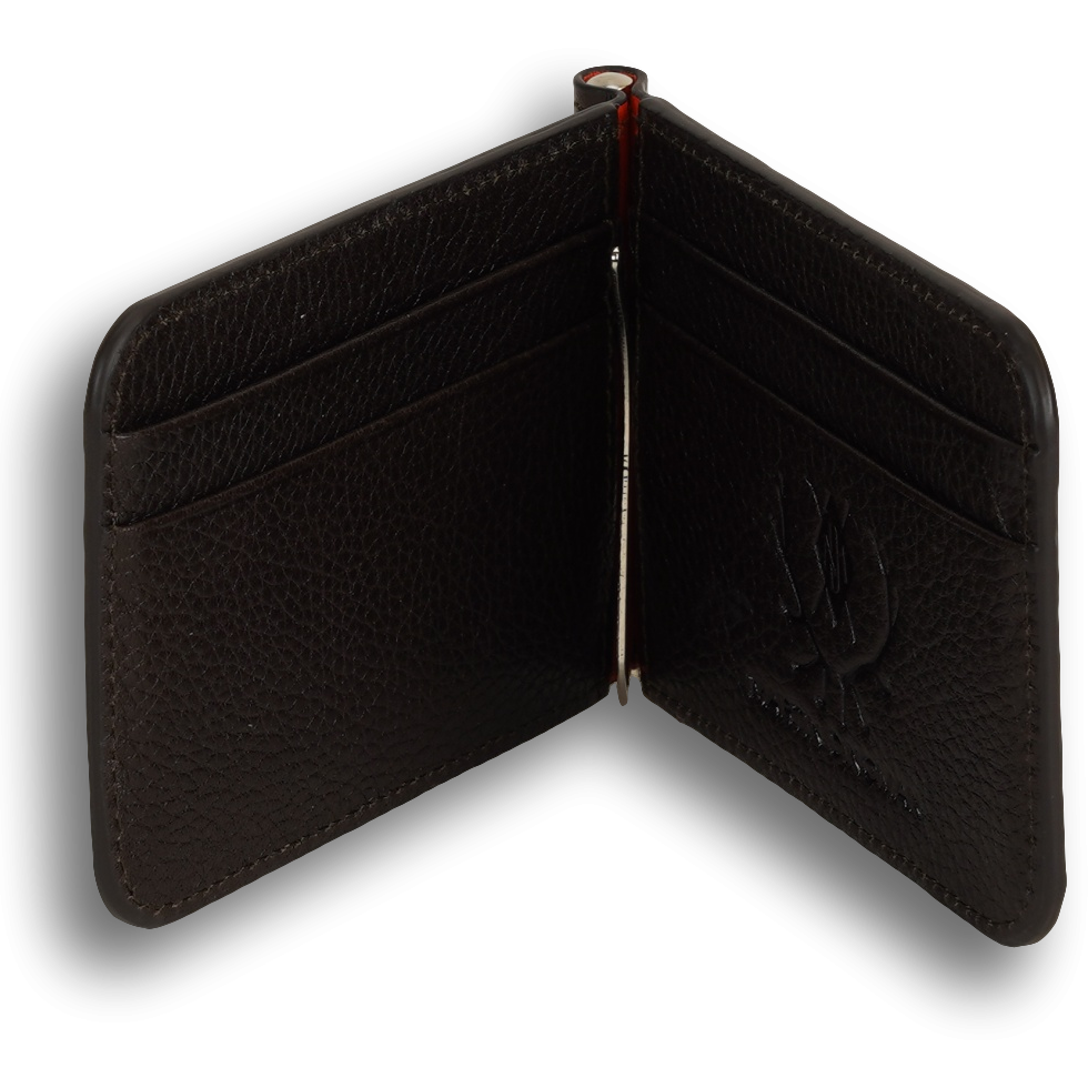 This premium money clip wallet is crafted in the USA from naturally tanned cowhide leather. The wallet features ample room including 4 credit card slots, two inside side pockets and an clip inside the fold for bills. A full leather construction including a smooth cowhide exterior, textured leather interior, and bold orange leather inside slide pockets creates the perfect look and long-lasting durability.