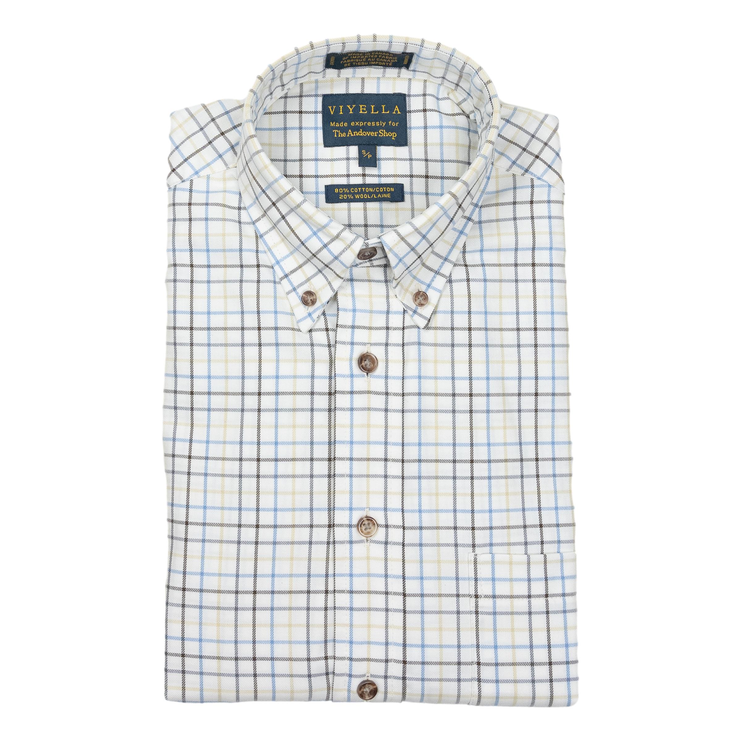 This traditional fit long sleeve button-down Viyella collection shirt is made from 80% cotton and 20% wool. The brushed finish creates a soft and warm feel and the classic tattersall style is great for any fall or winter evening. Classic Fit. Button Down. Made in Canada for The Andover Shop.