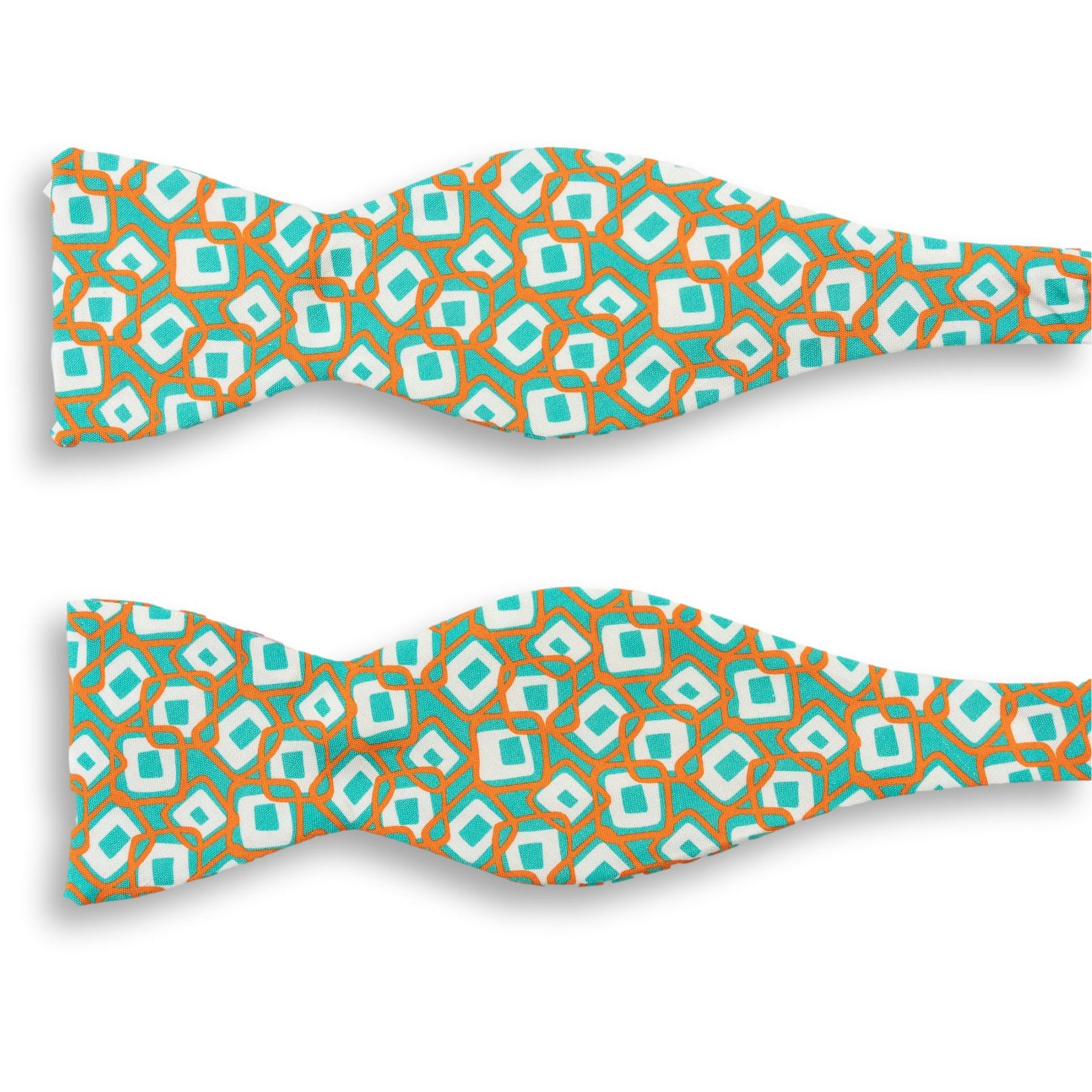 Orange, Teal, and White Abstract Square Patterned Silk Bow Tie