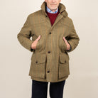 At home in the field or suitably stylish for city living, the Chepstow is a modern fit field coat. Made from the finest British tweed, the attention to design and functionality ensure the wearer is warm, dry and comfortable at all times. This Jacket is a custom Andover Shop design specially made for our shop. It features a crimson lining and silk arm sleeve lining for functionality.