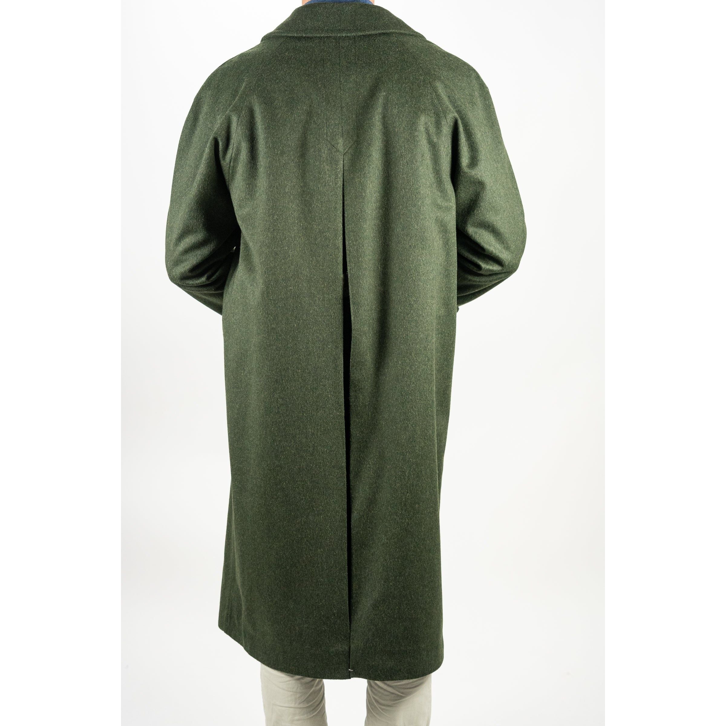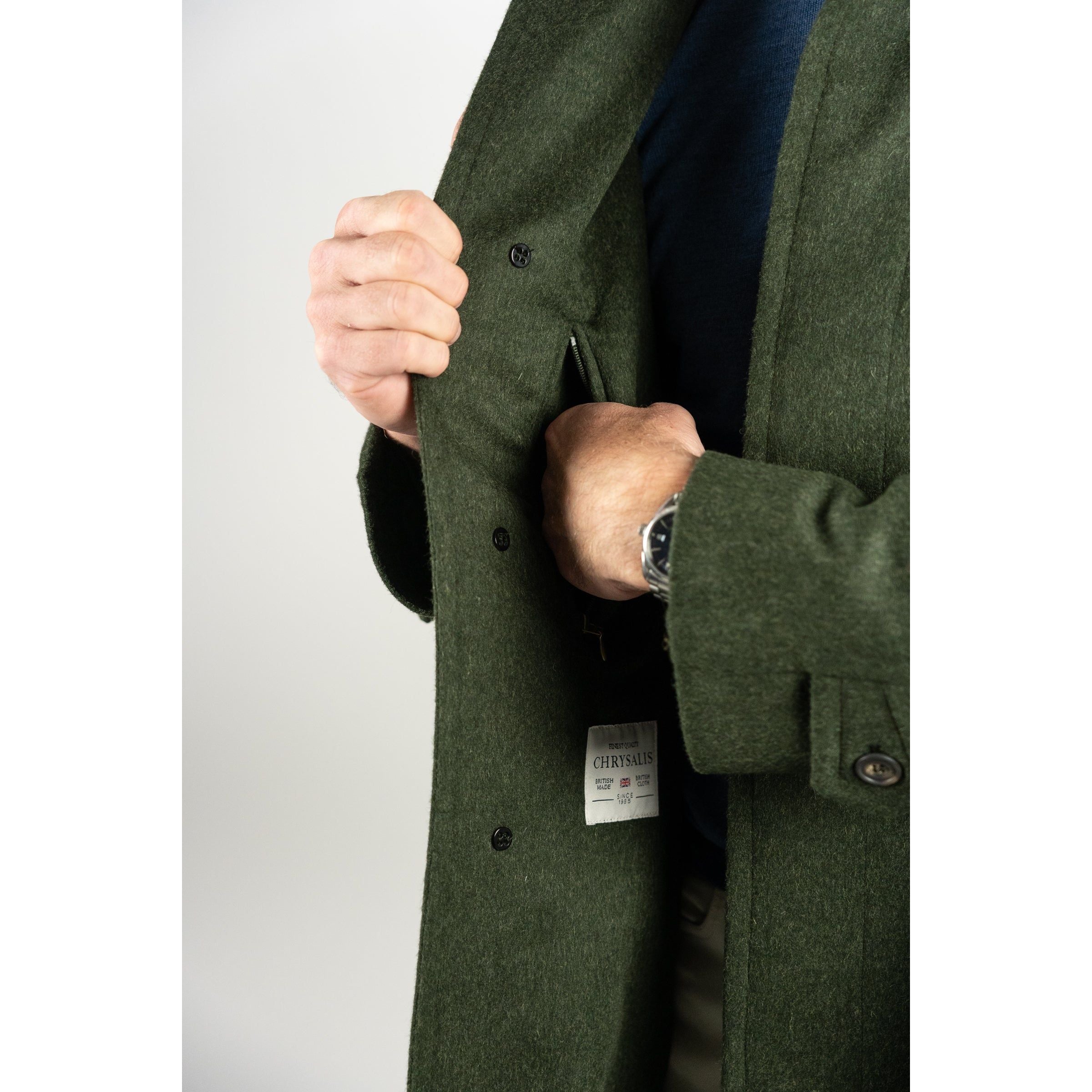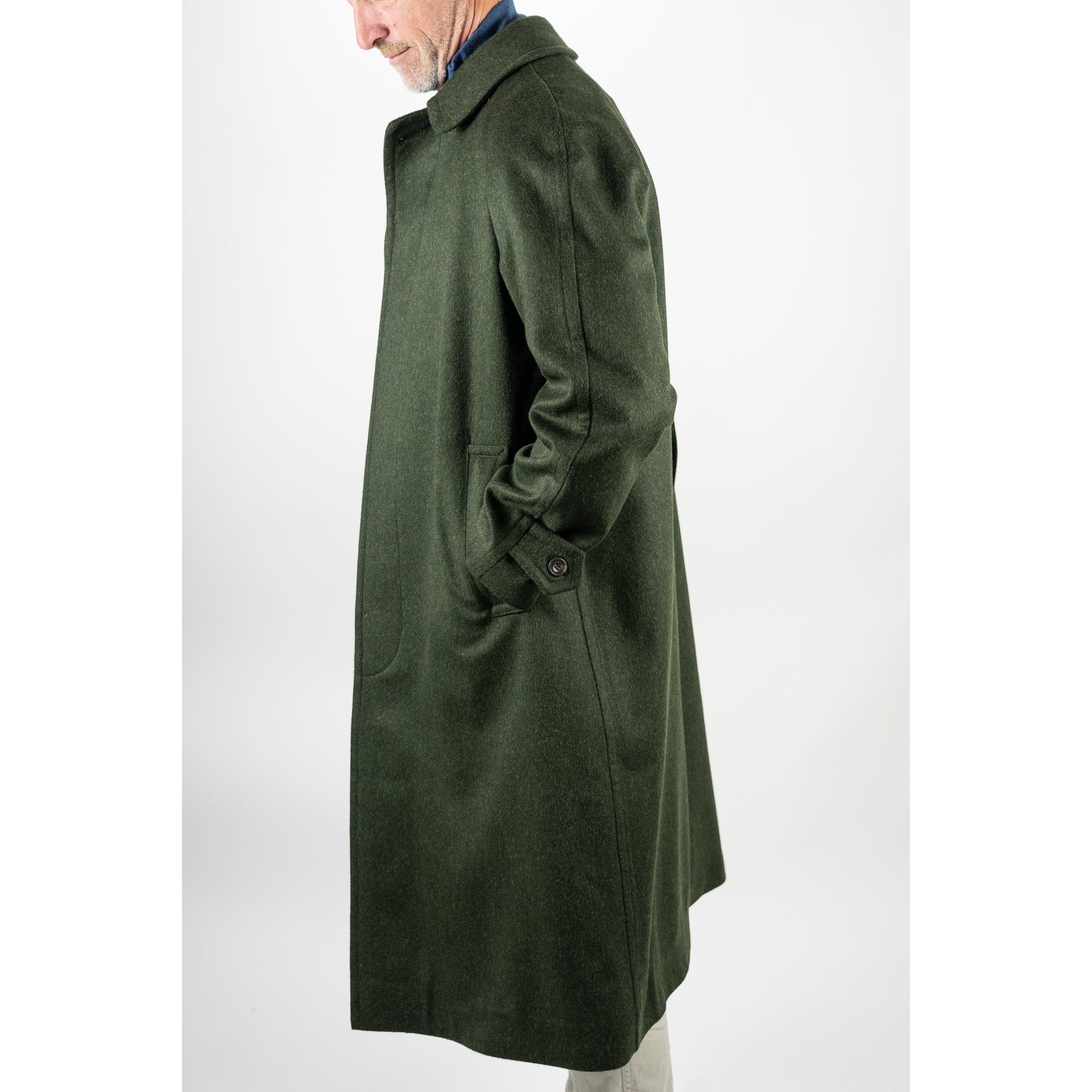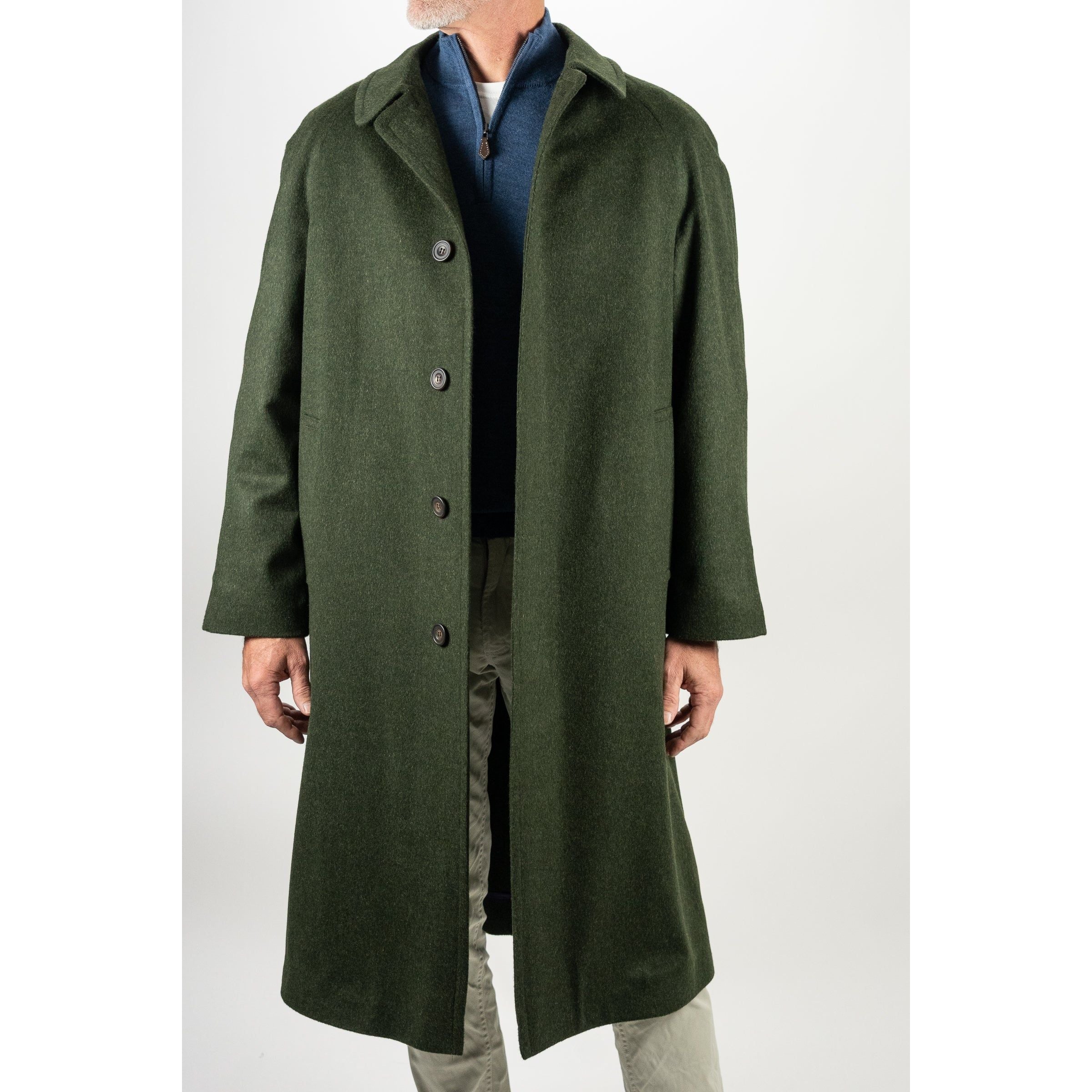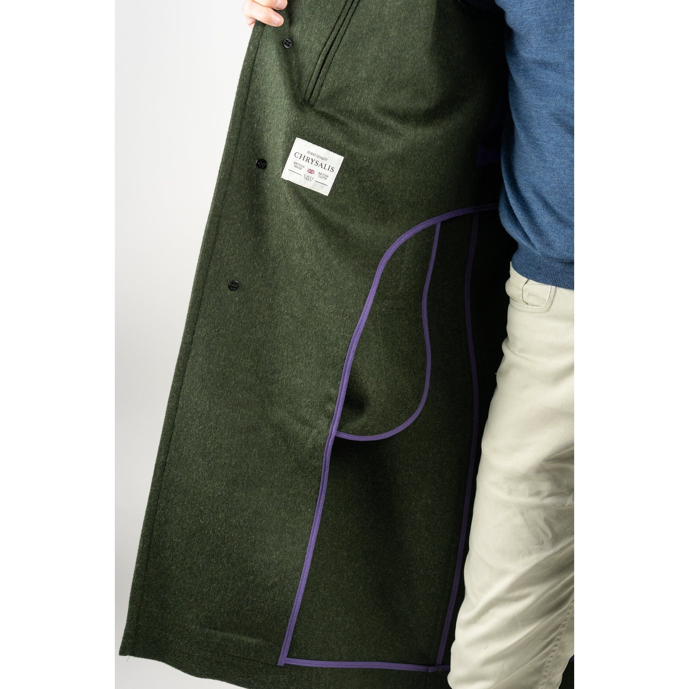 An elegant twist on the classic British raglan topcoat, this piece features a full-length raglan cut with a buttoned fly front. Crafted from a rich olive green loden outer fabric, it offers both style and substance. Inside, you'll discover an essential zip security pocket, and the deep purple wool cloth interior. The olive silk-lined sleeves and convenient slash pockets offer added detail along with the button cuffs for more functionality. Notable details include the inverted pleat, front slash pockets, raglan sleeves, and a refined five-button fly front closure.