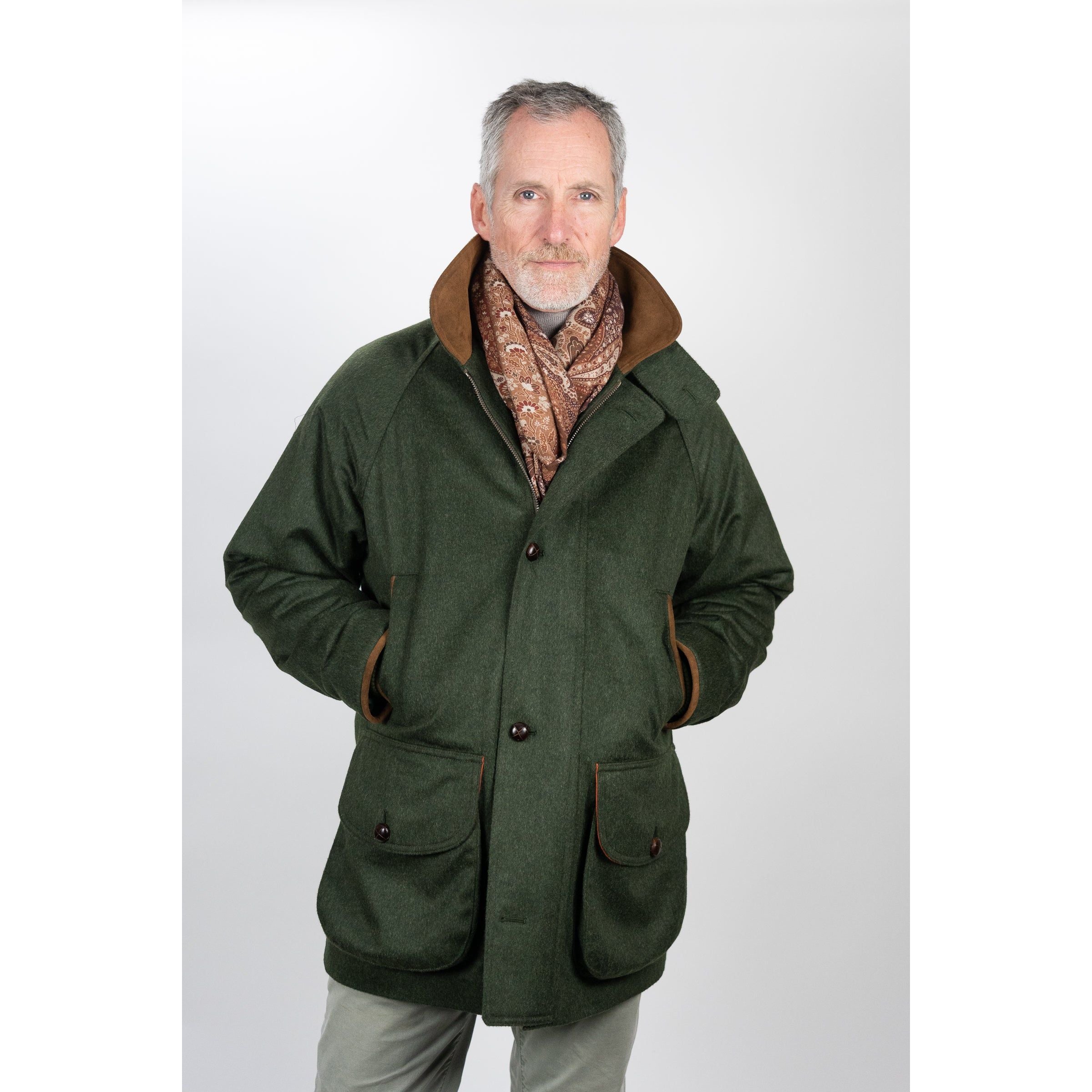 The Chiltern is our classic men’s field coat made from the finest British Loden. All Chrysalis field coats are waterproof as they incorporate a breathable internal membrane along with storm cuff, pivot sleeve. Engineering and the best of British tailoring ensures the wearer is warm, dry and comfortable at all times. This jacket features olive loden wool with a hunter orange lining.