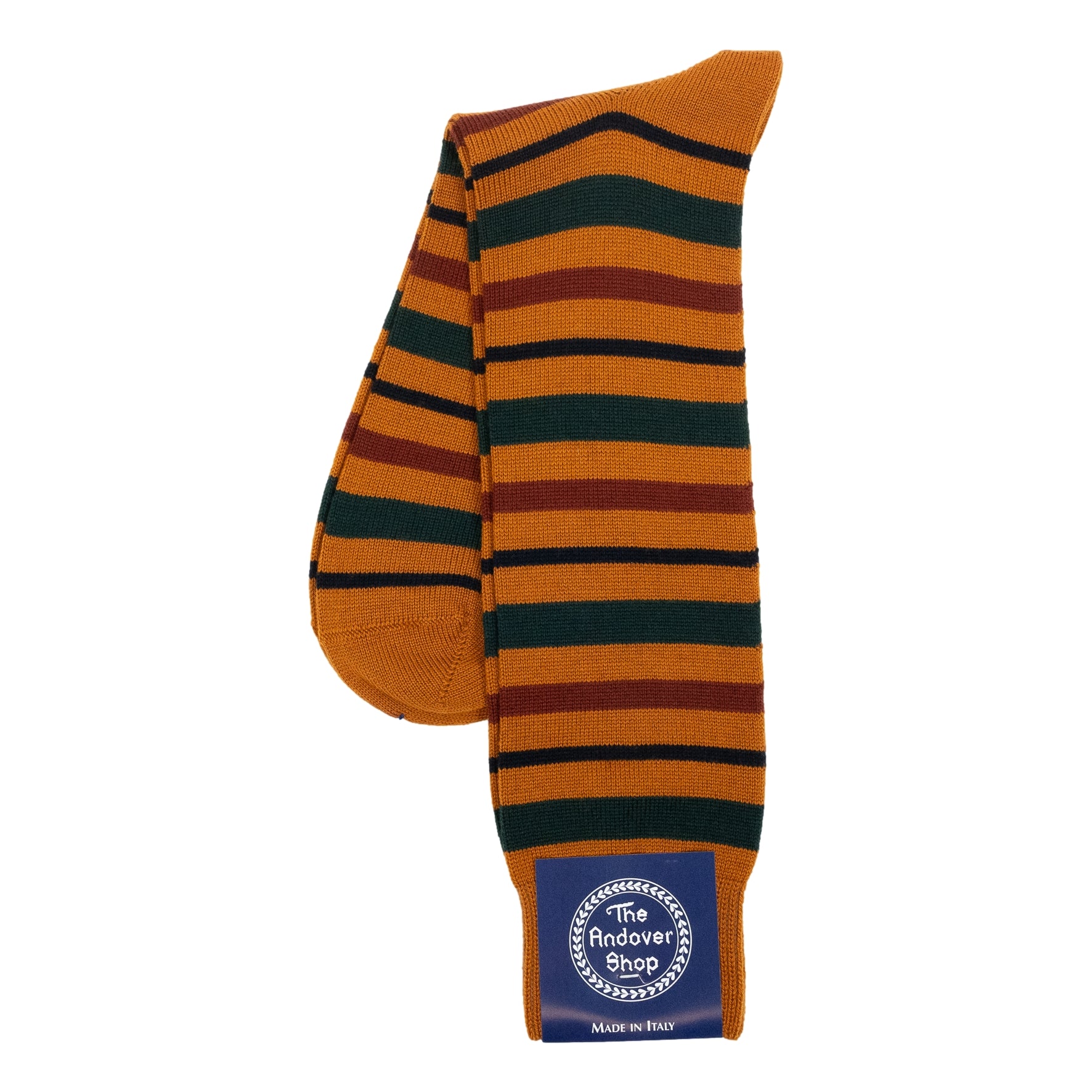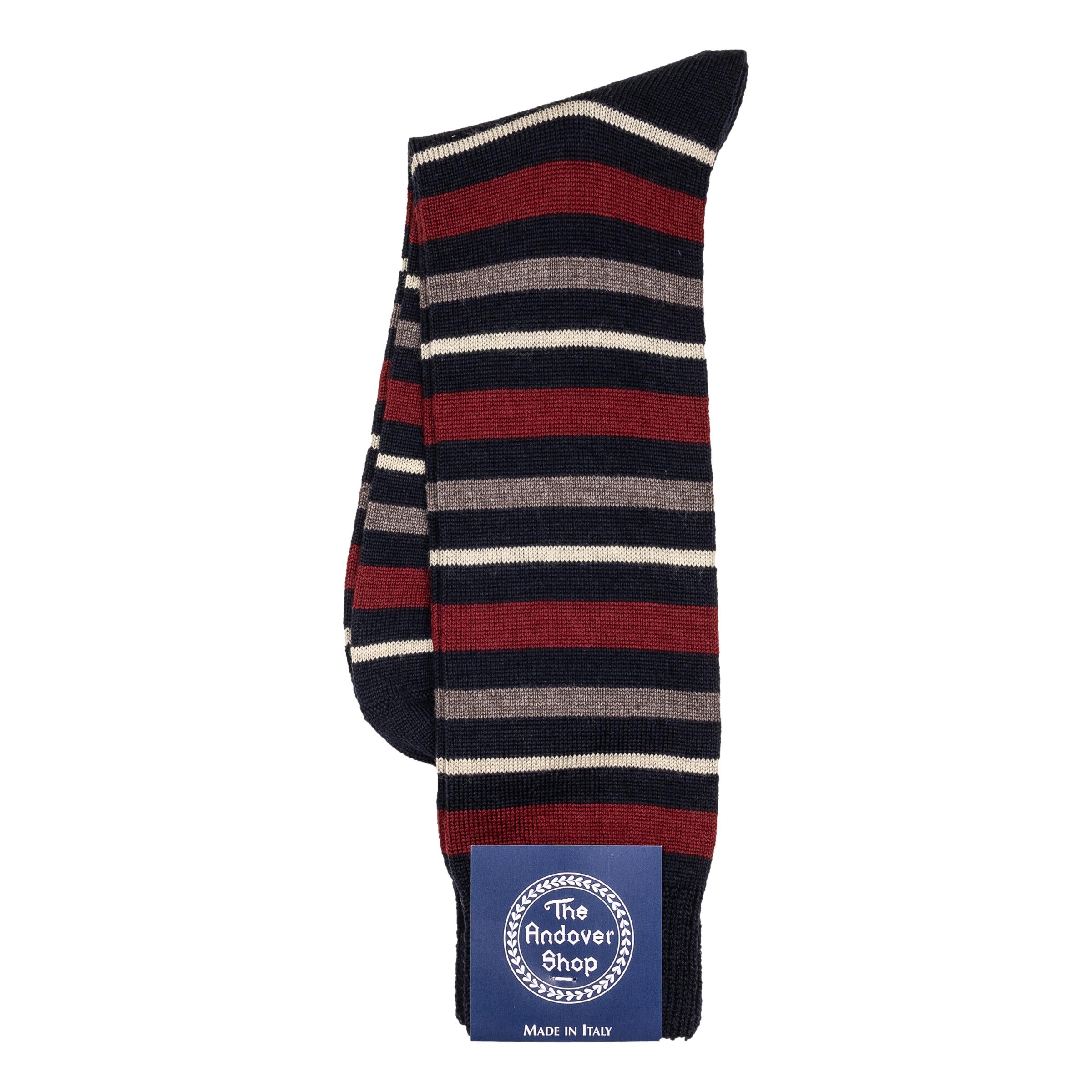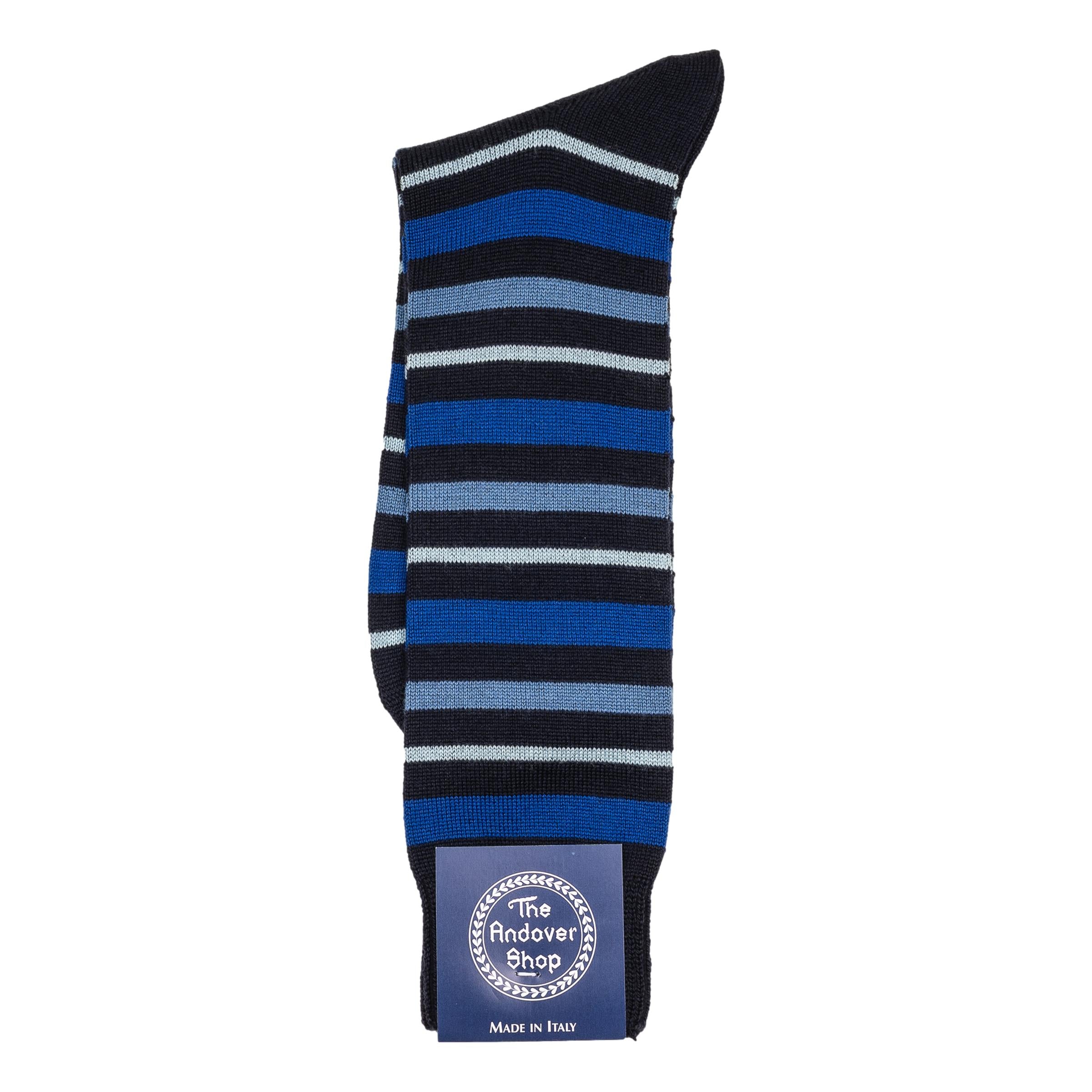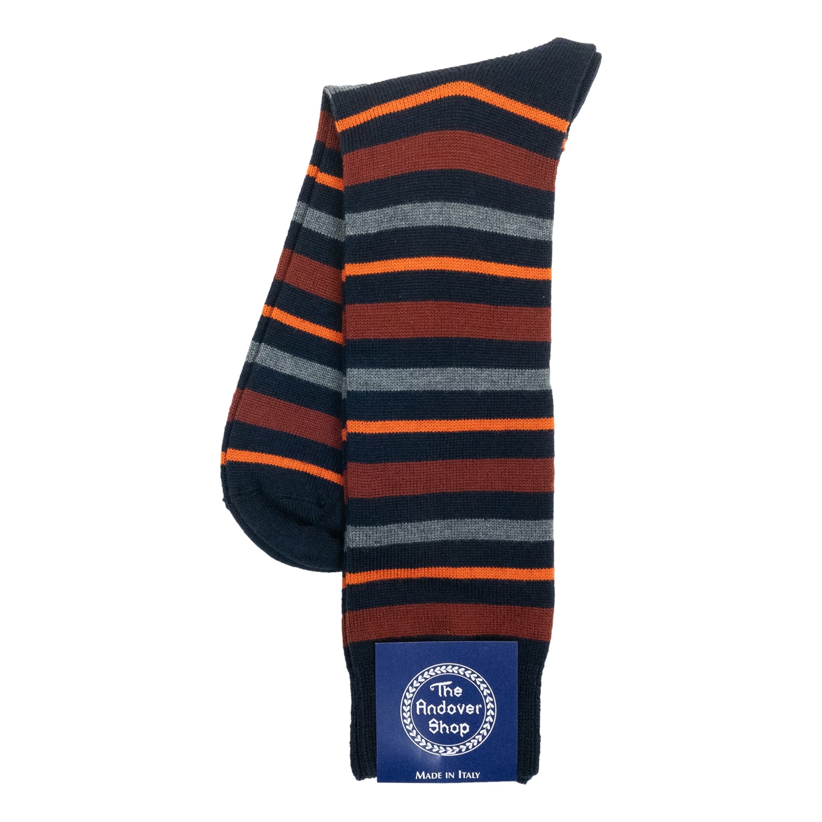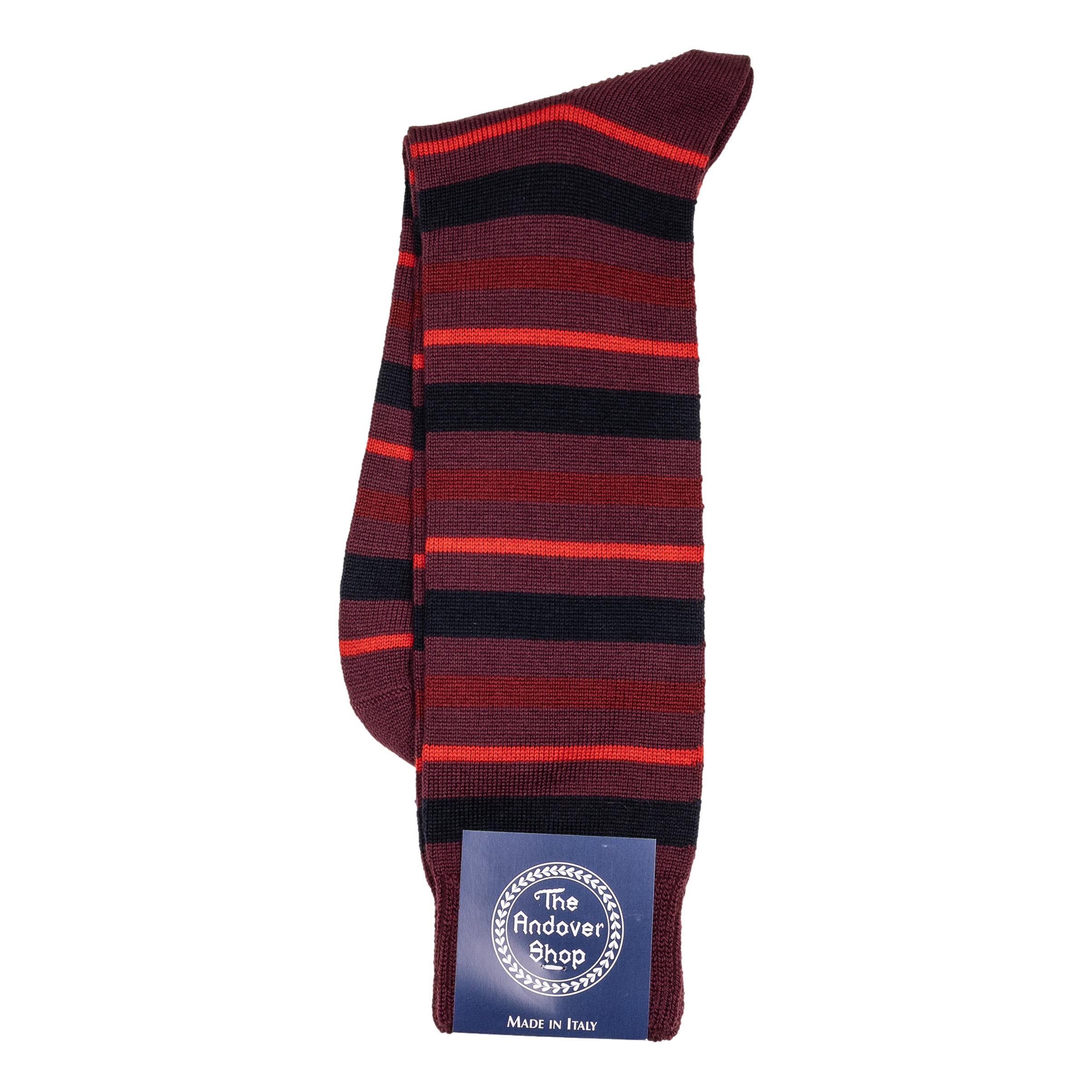 This Mid-Calf Multi Stripe Wool Dress Socks can be worn on any occasion, casual or formal, and is a quintessential staple for any gentleman who enjoys spicing up his wardrobe. Made from fine wool in Italy for The Andover Shop. One size fits most.