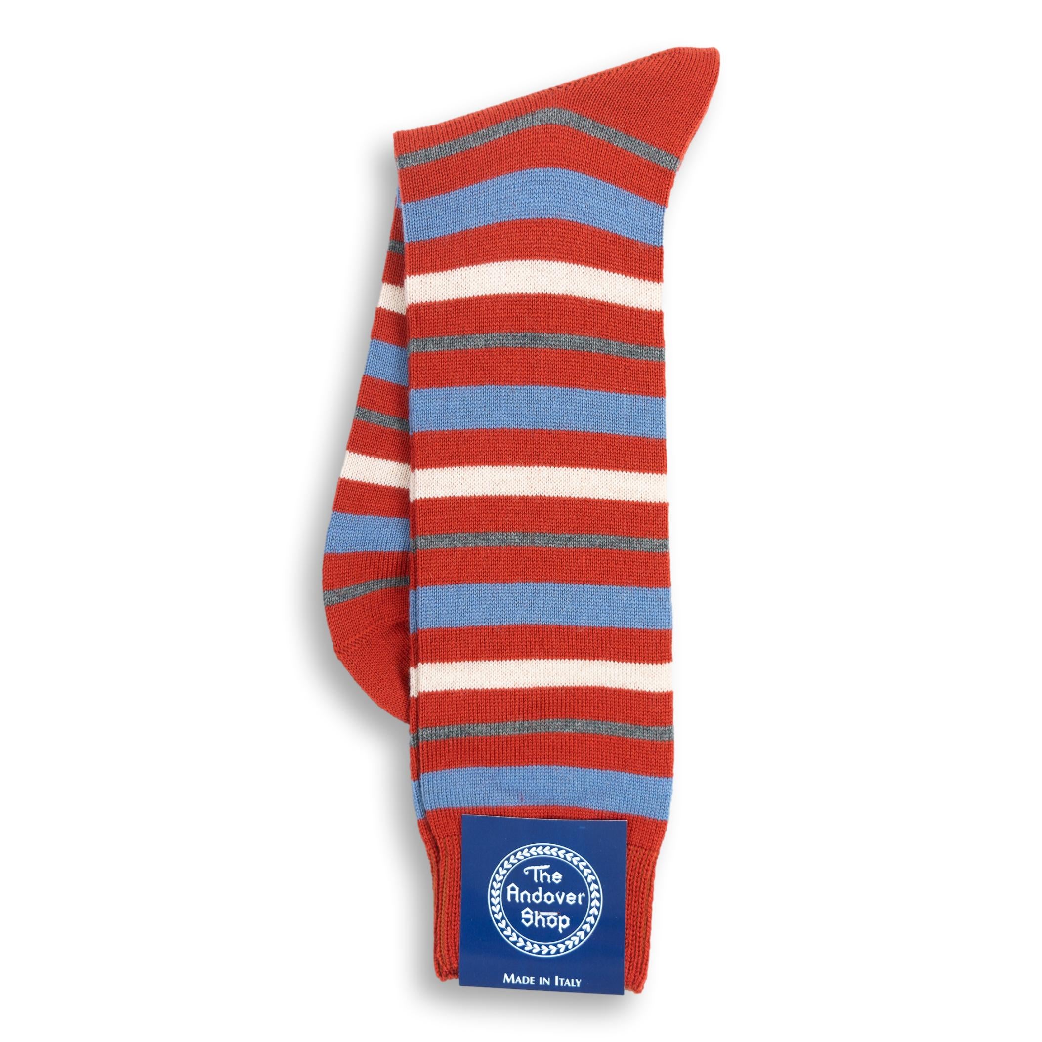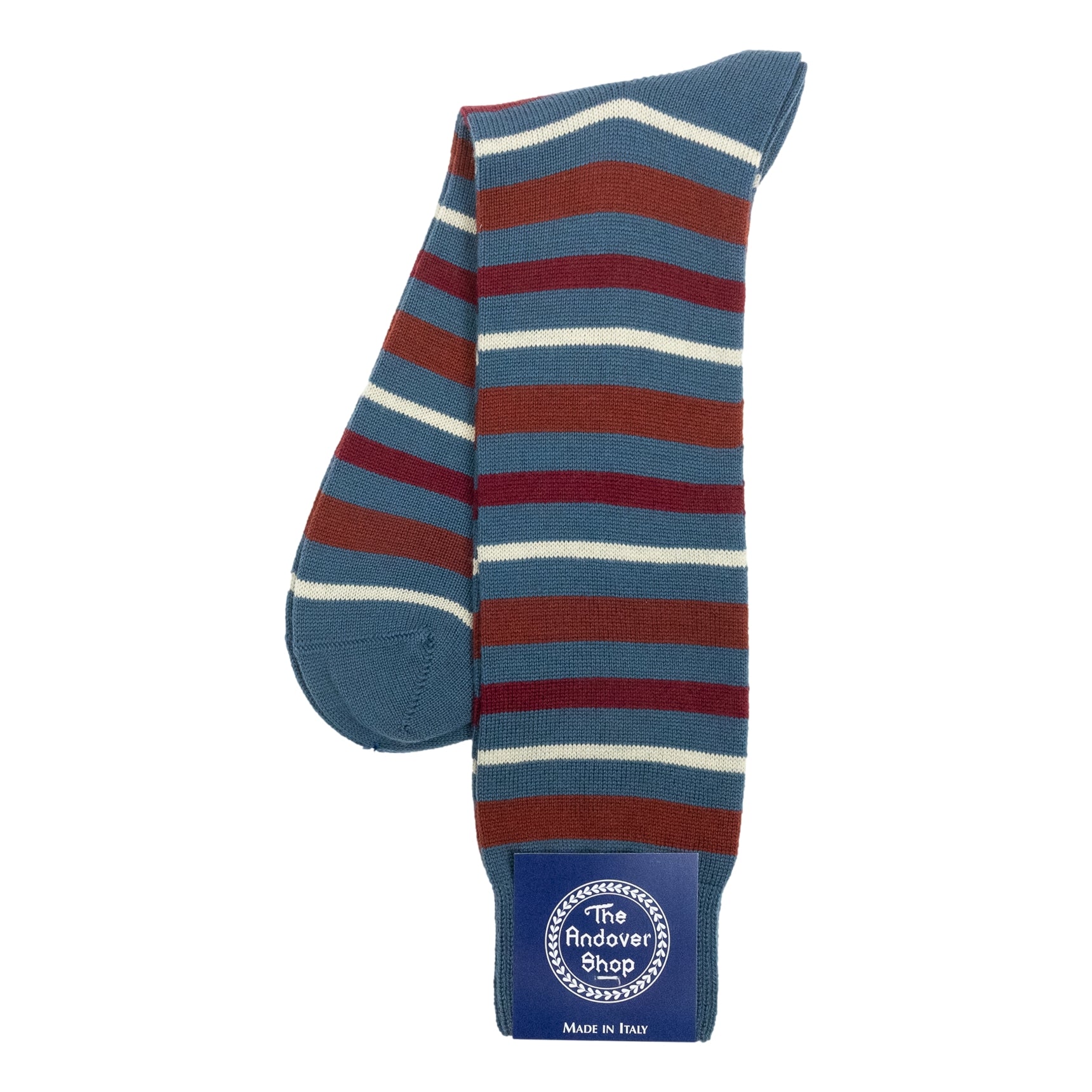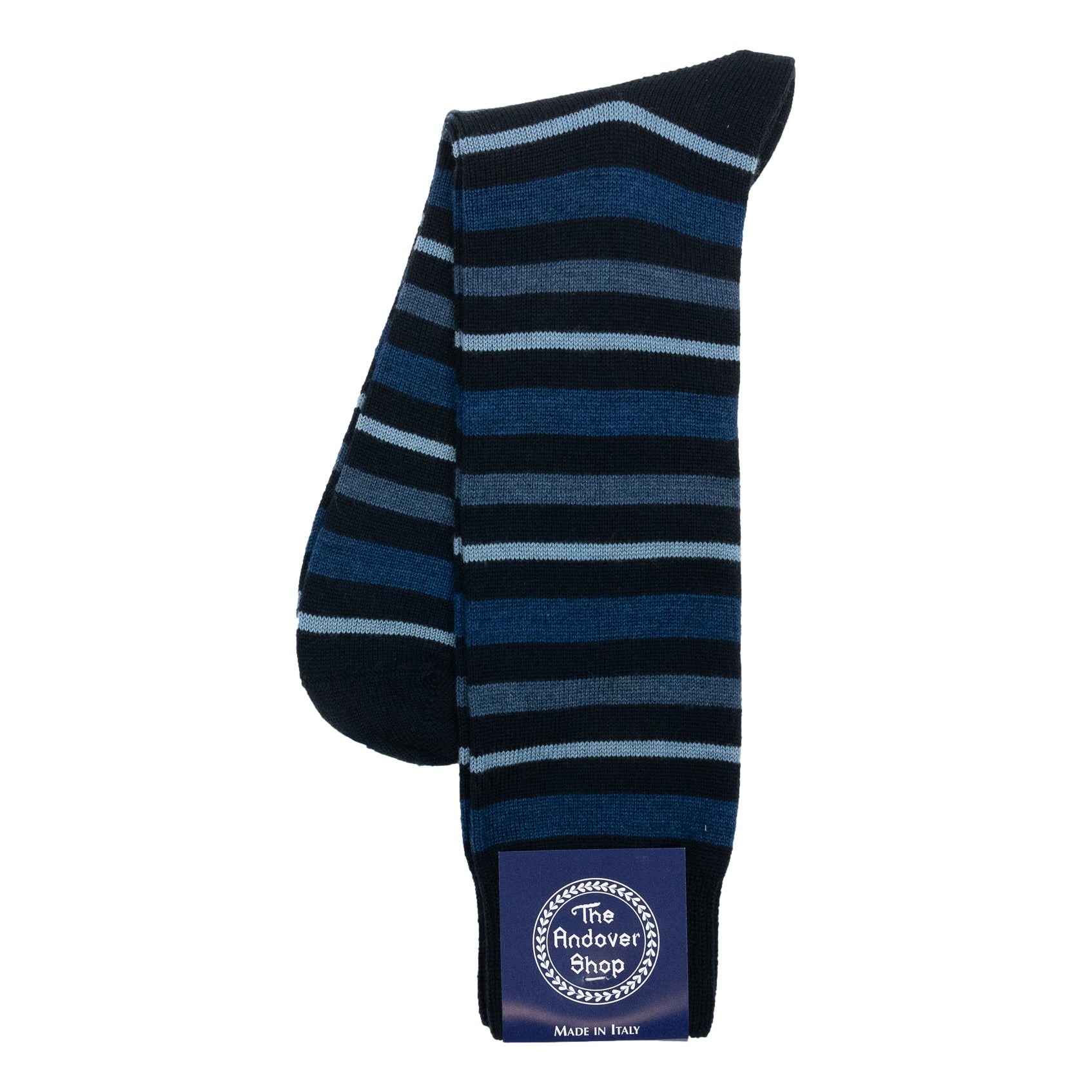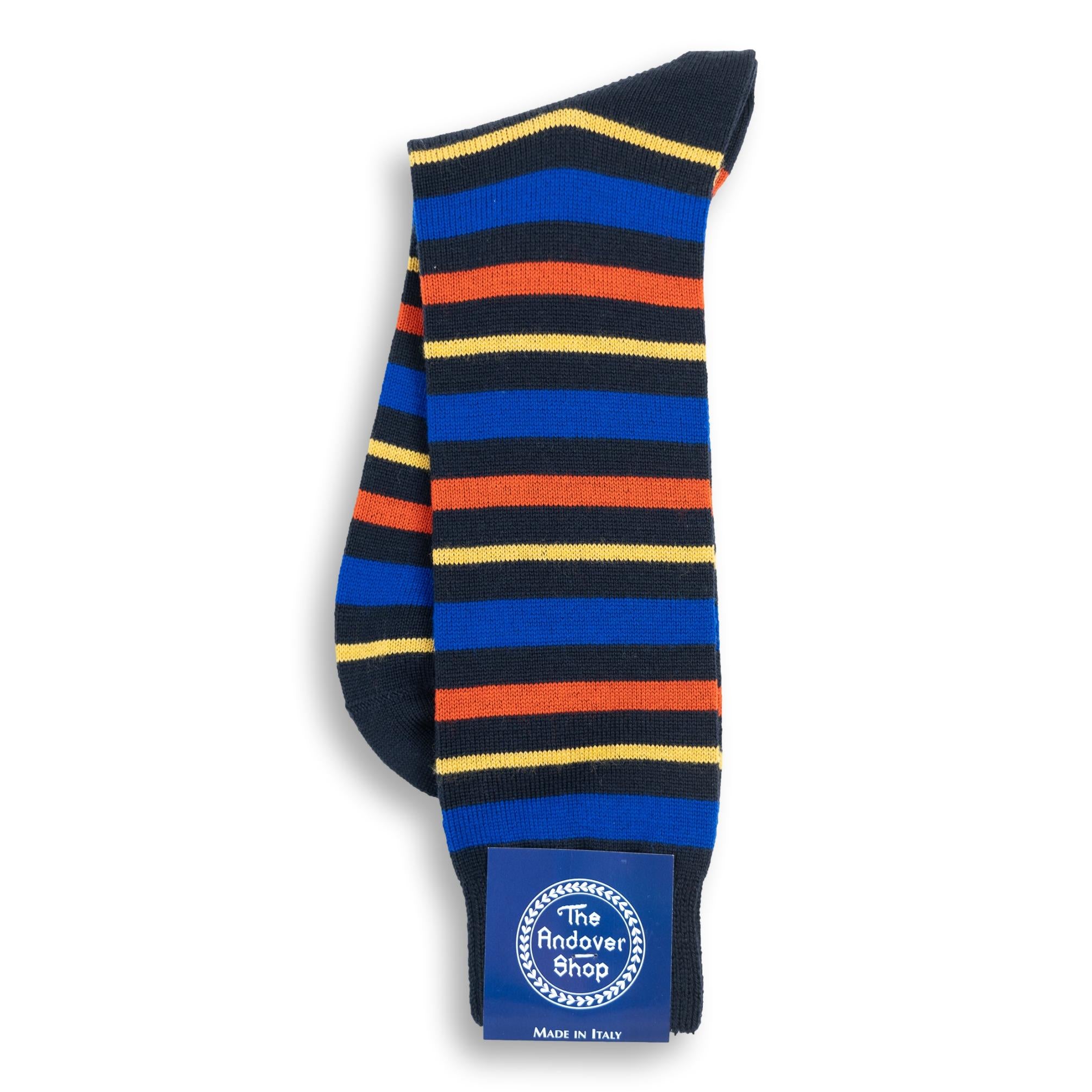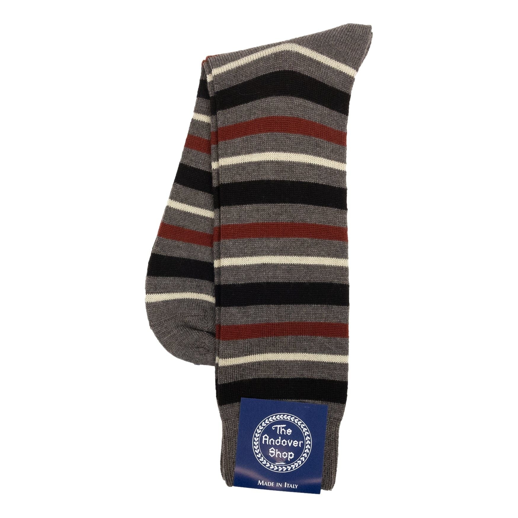 This Mid-Calf Multi Stripe Wool Dress Socks can be worn on any occasion, casual or formal, and is a quintessential staple for any gentleman who enjoys spicing up his wardrobe. Made from fine wool in Italy for The Andover Shop. One size fits most.
