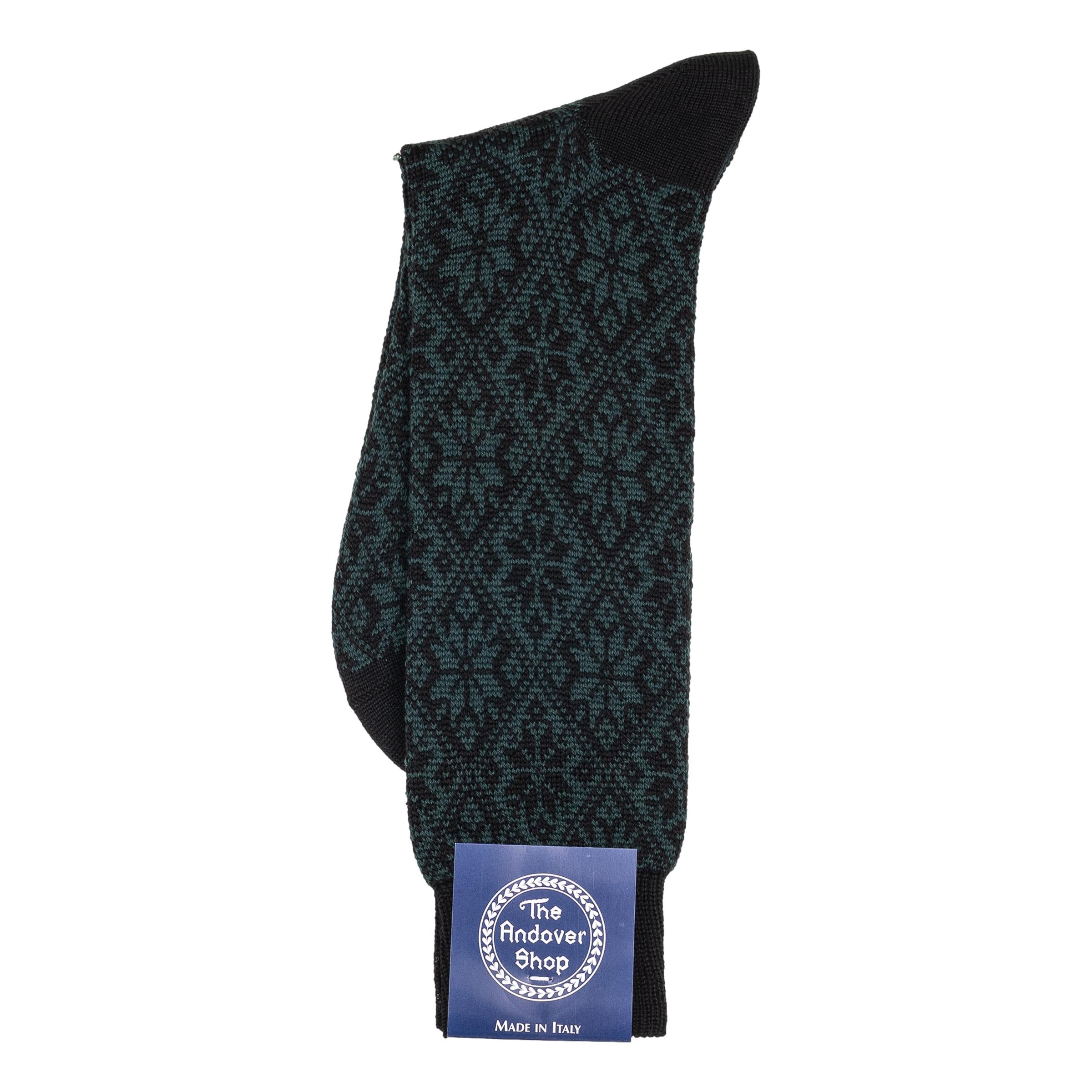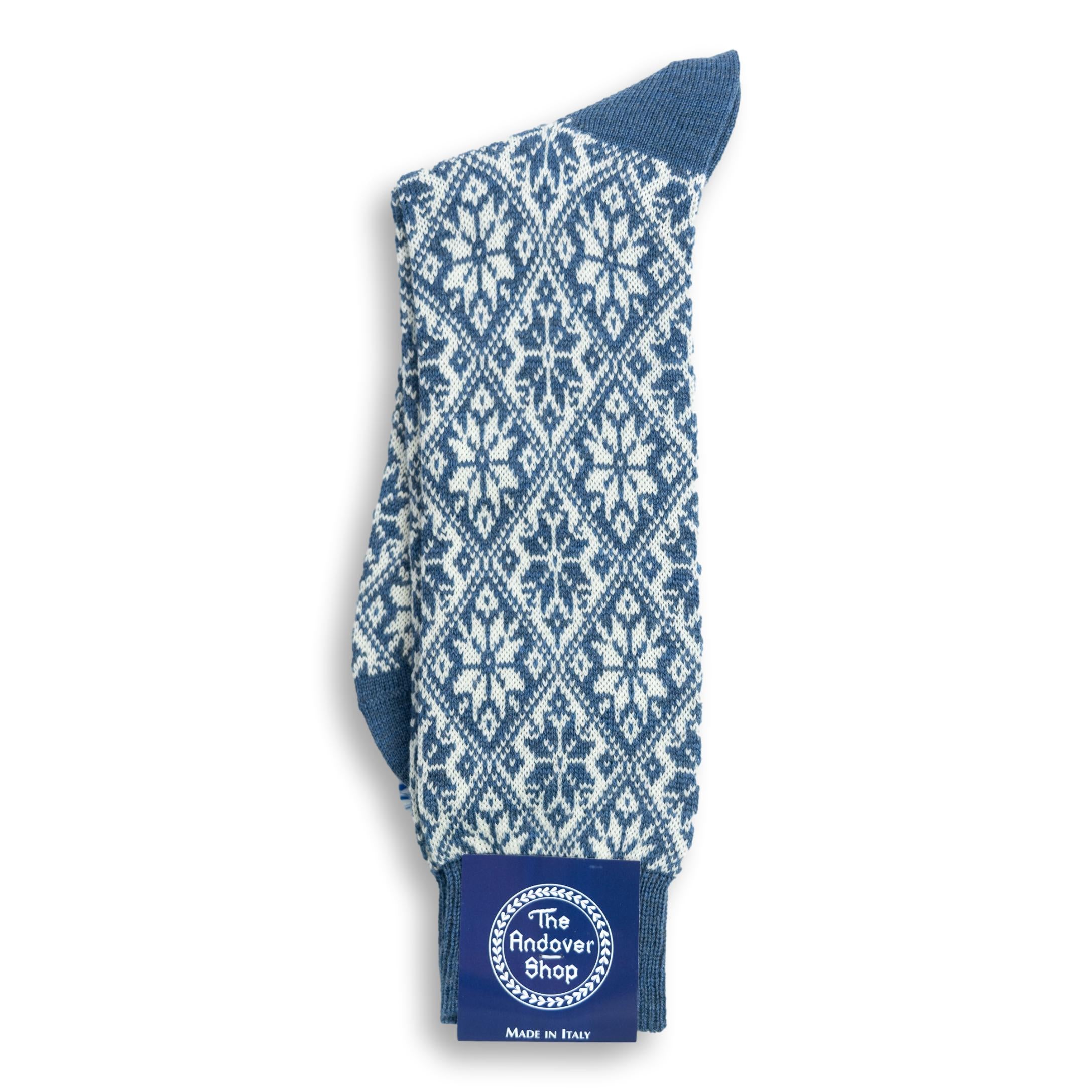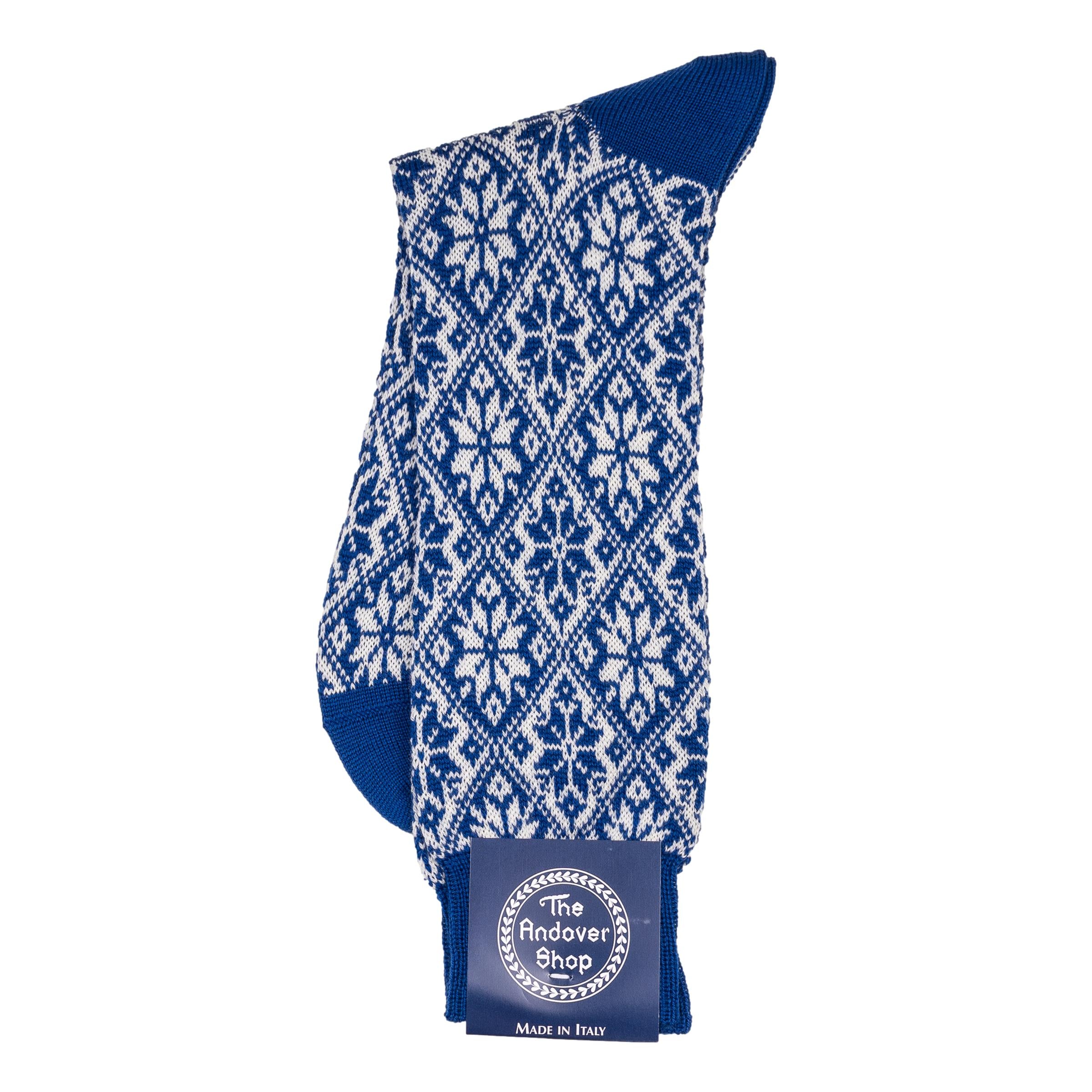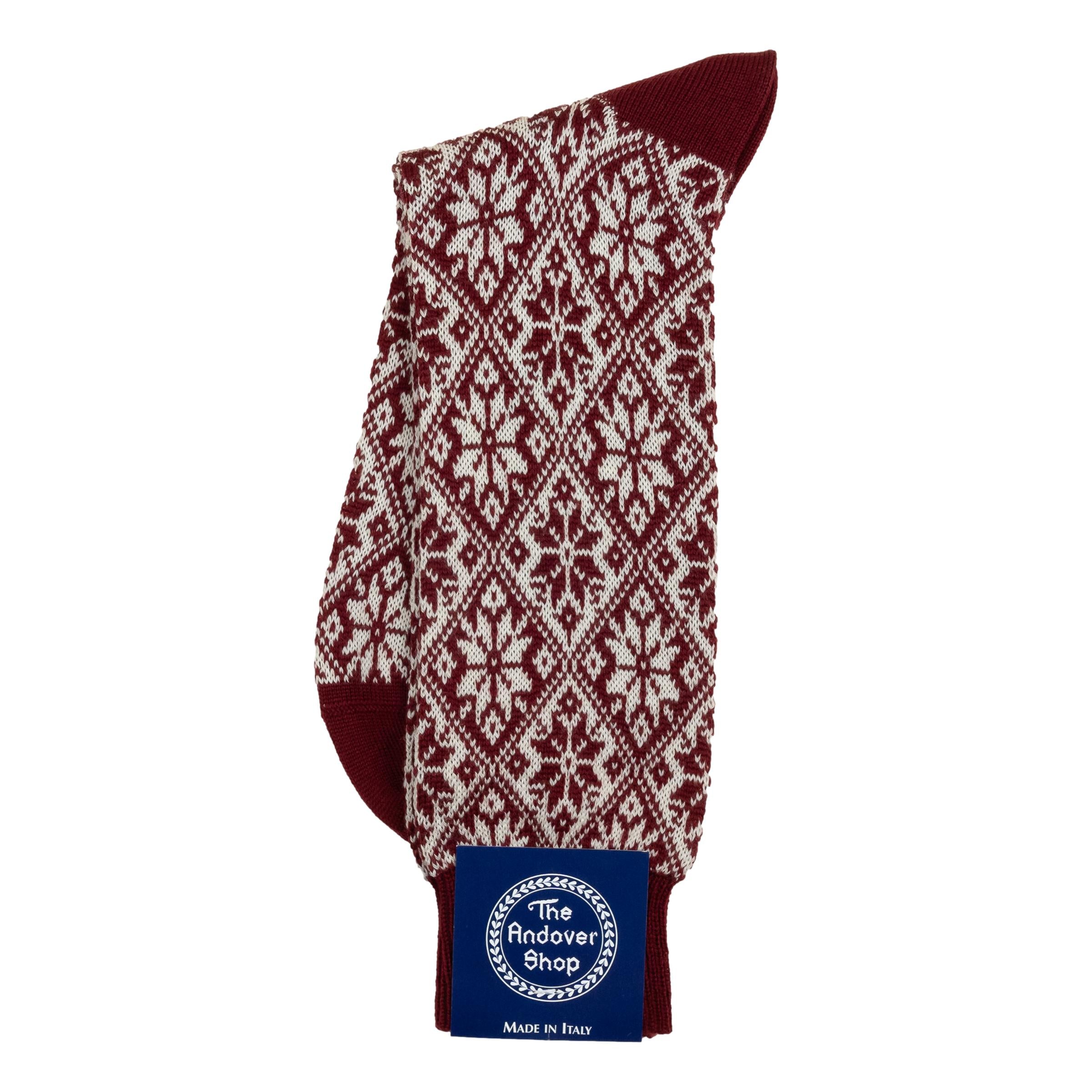 This mid-calf snowflake pattern wool dress sock can be worn on any occasion, casual or formal, and is a quintessential staple for any gentleman who enjoys spicing up his wardrobe. Made from fine wool in Italy for The Andover Shop. One size fits most.