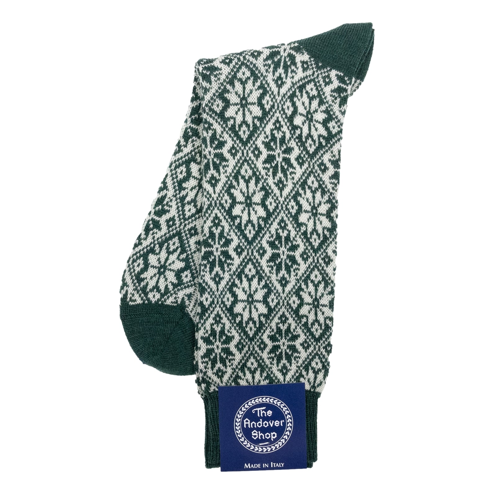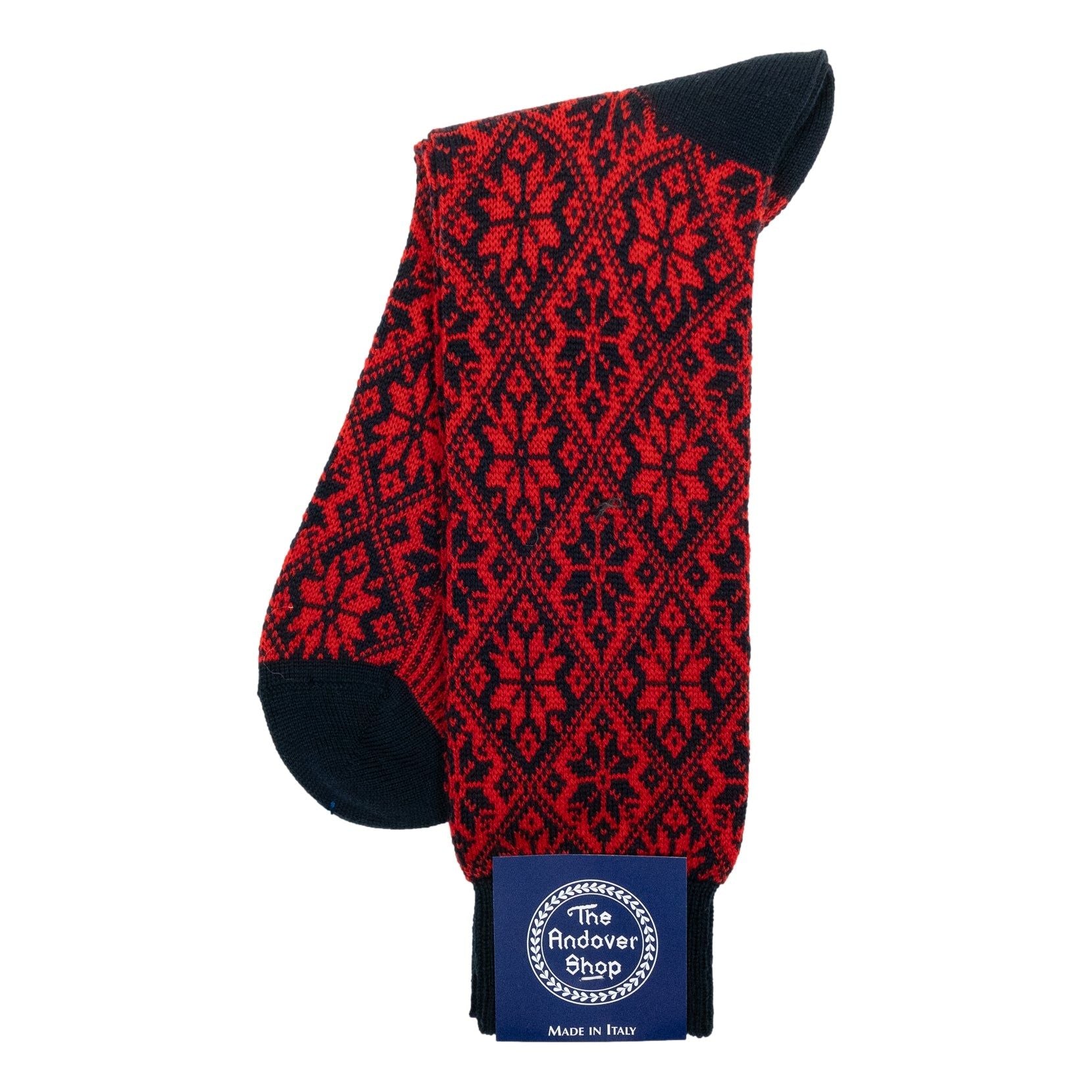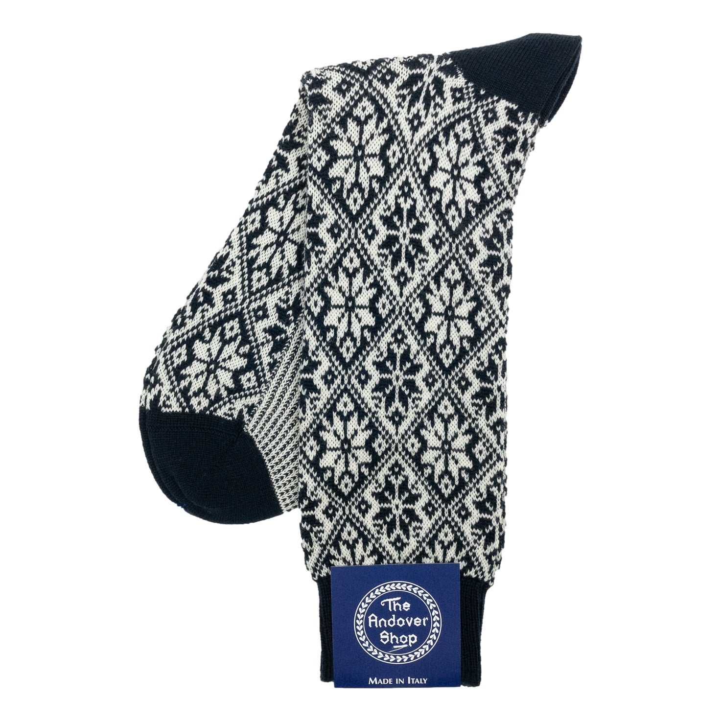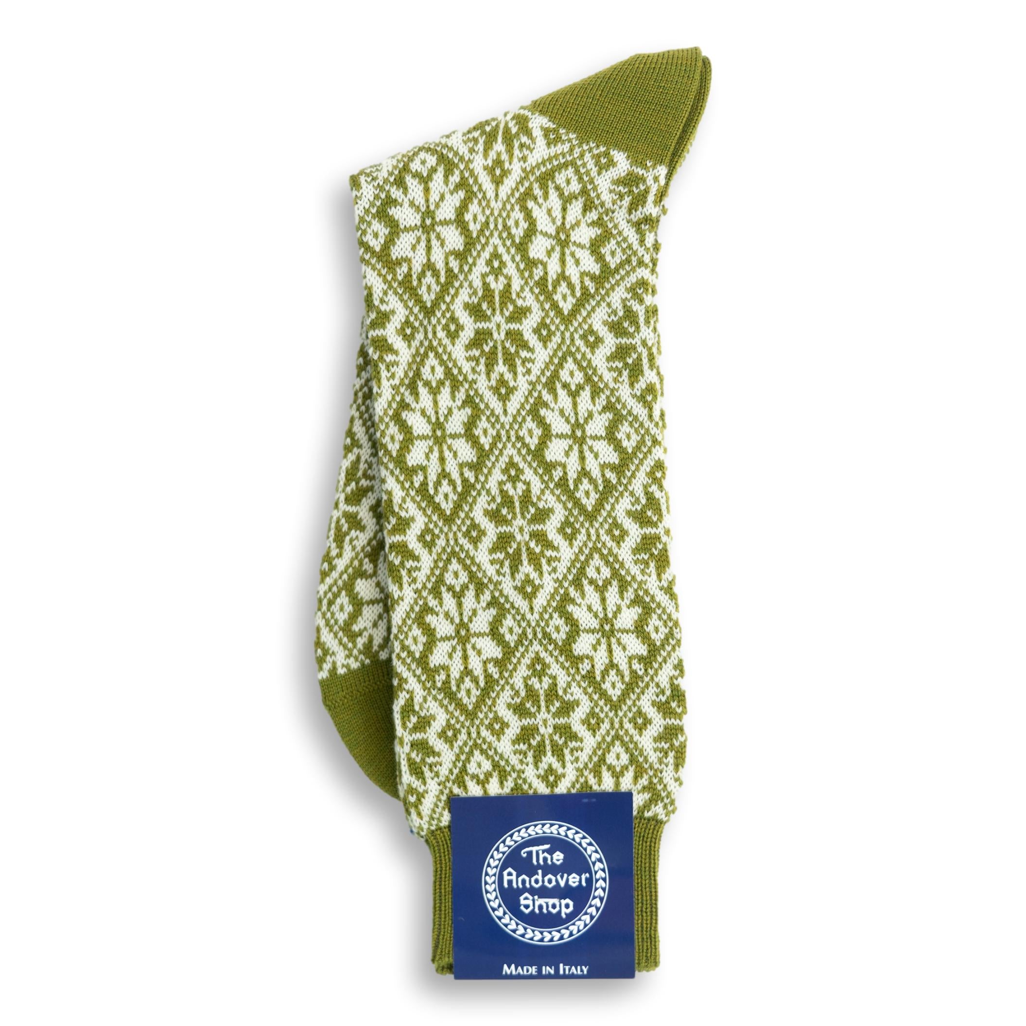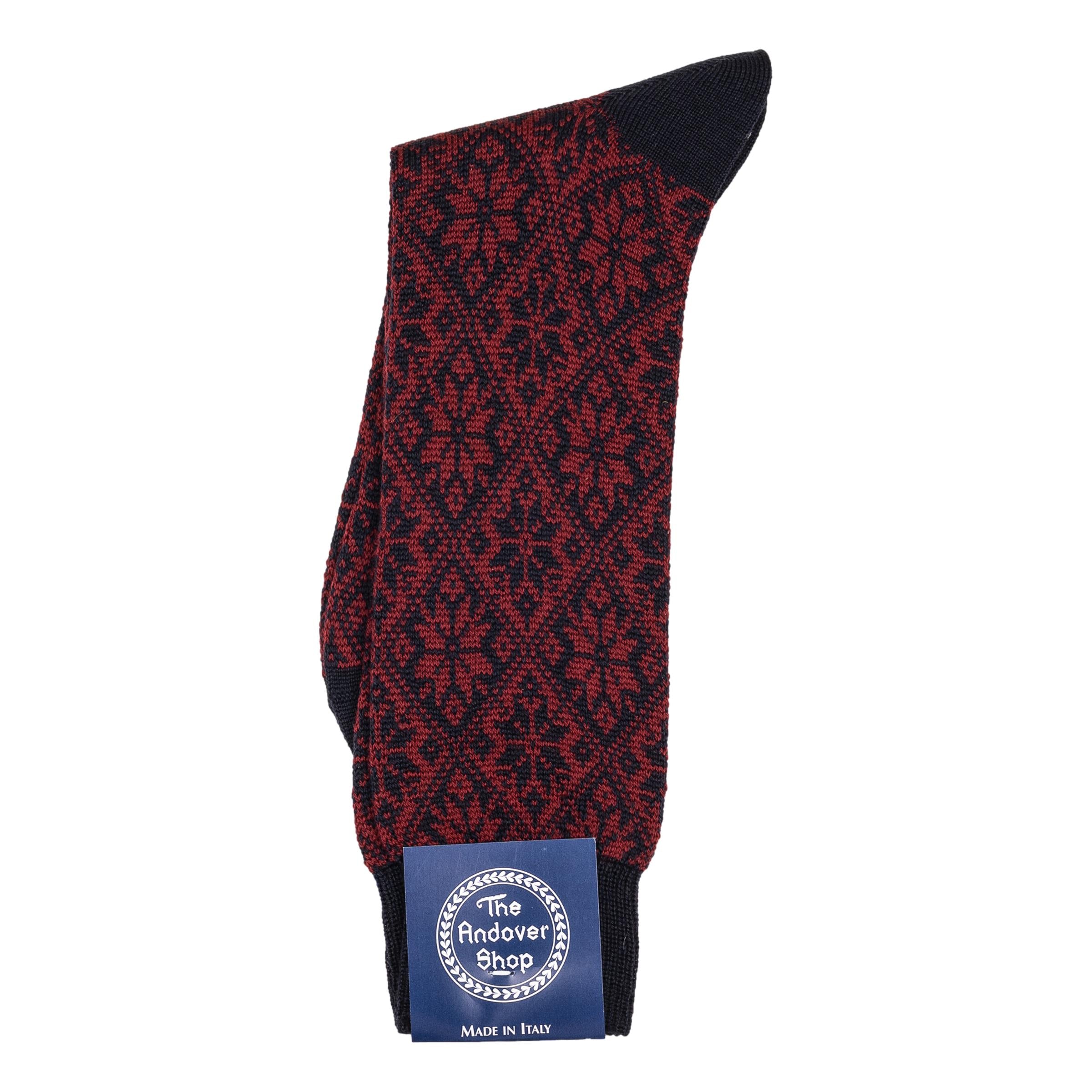 This mid-calf snowflake pattern wool dress sock can be worn on any occasion, casual or formal, and is a quintessential staple for any gentleman who enjoys spicing up his wardrobe. Made from fine wool in Italy for The Andover Shop. One size fits most.