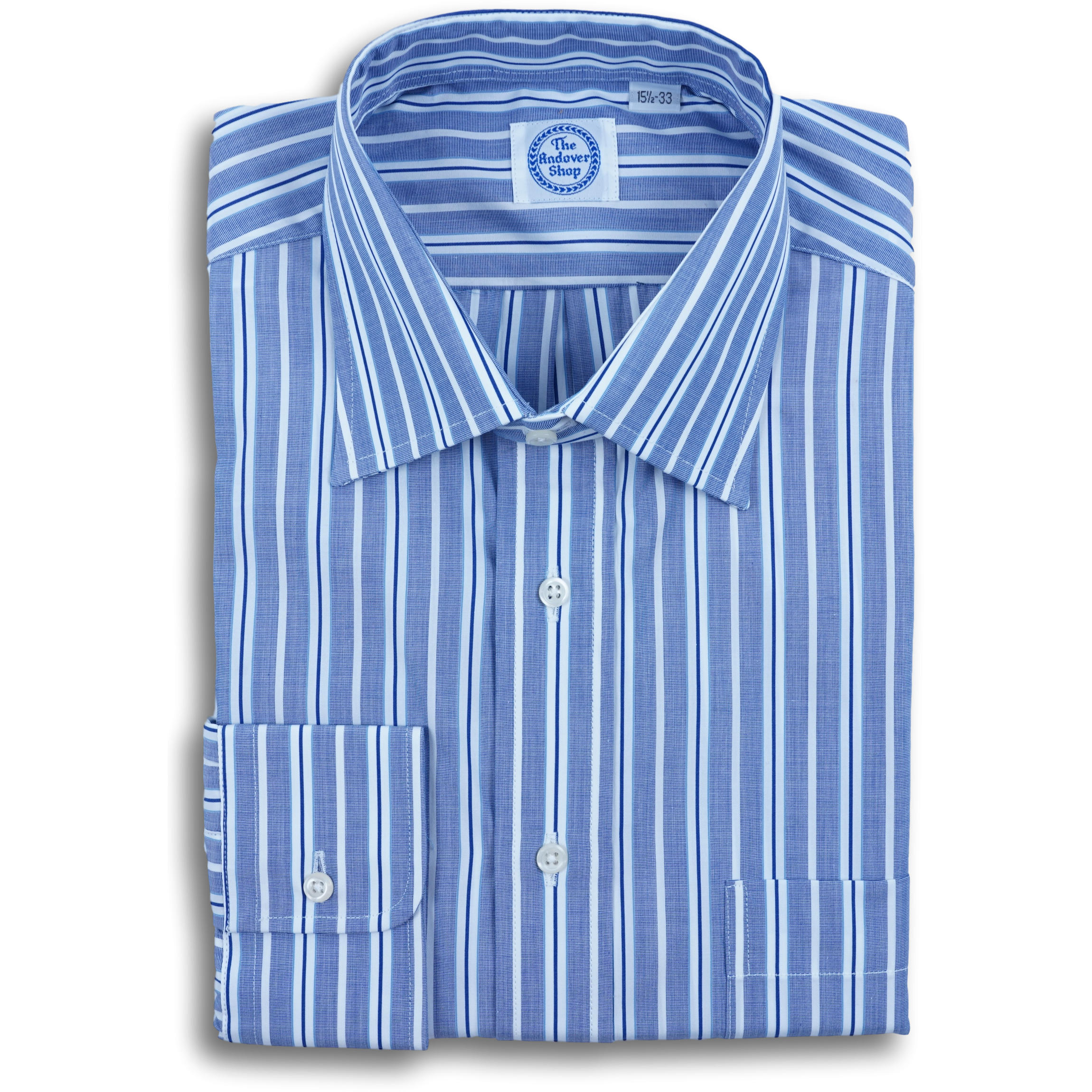 This traditional Andover fit dress shirt is made with a moderately spread collar, front placket, barrel cuff and chest pocket. The medium blue end-on-end ground provides a perfect contrast for the alternating cluster stripes of navy, white and sky blue. The cluster stripes create a traditional look but the alternating white stripes offer an interesting twist to a classic. Made from 100% premium cotton in the United States.