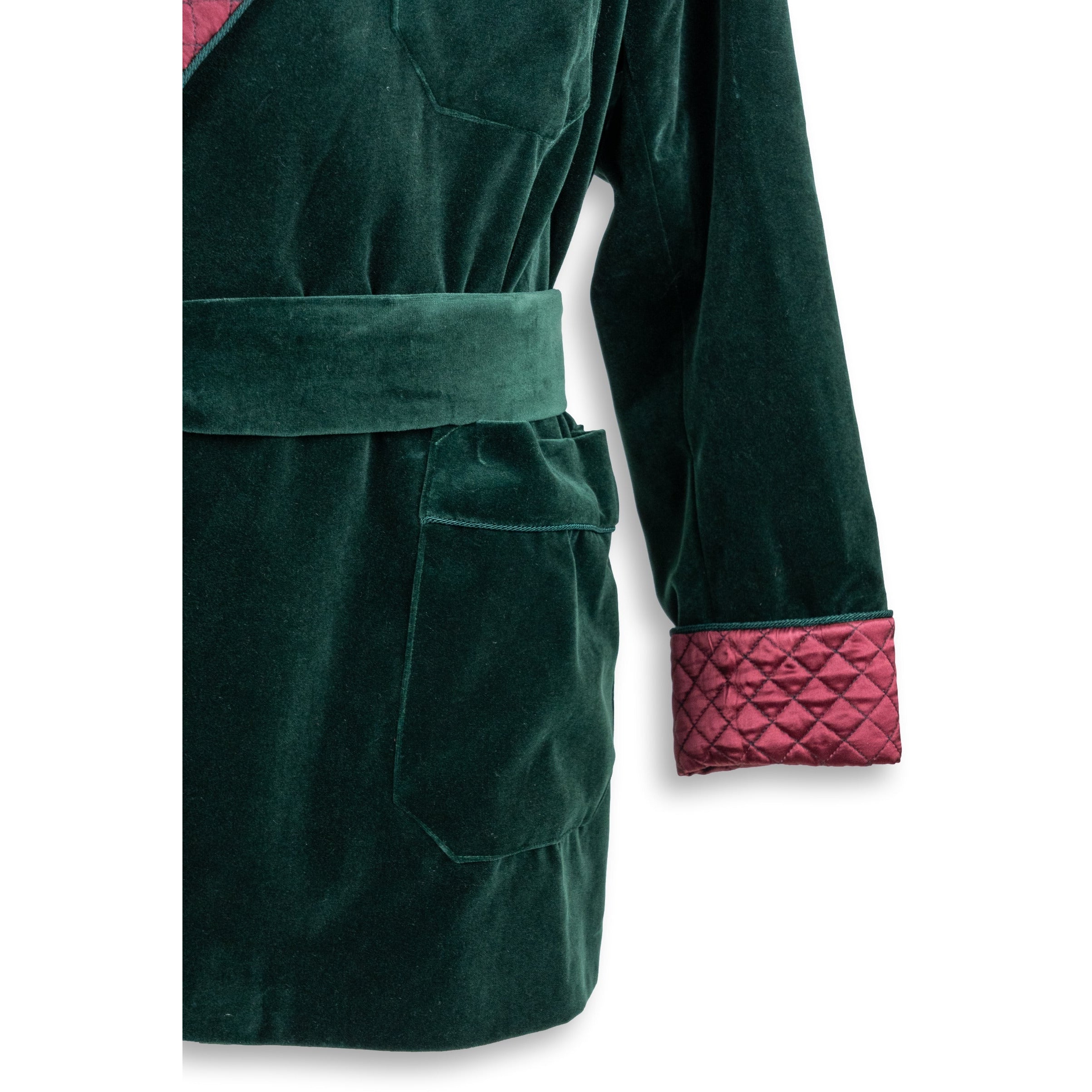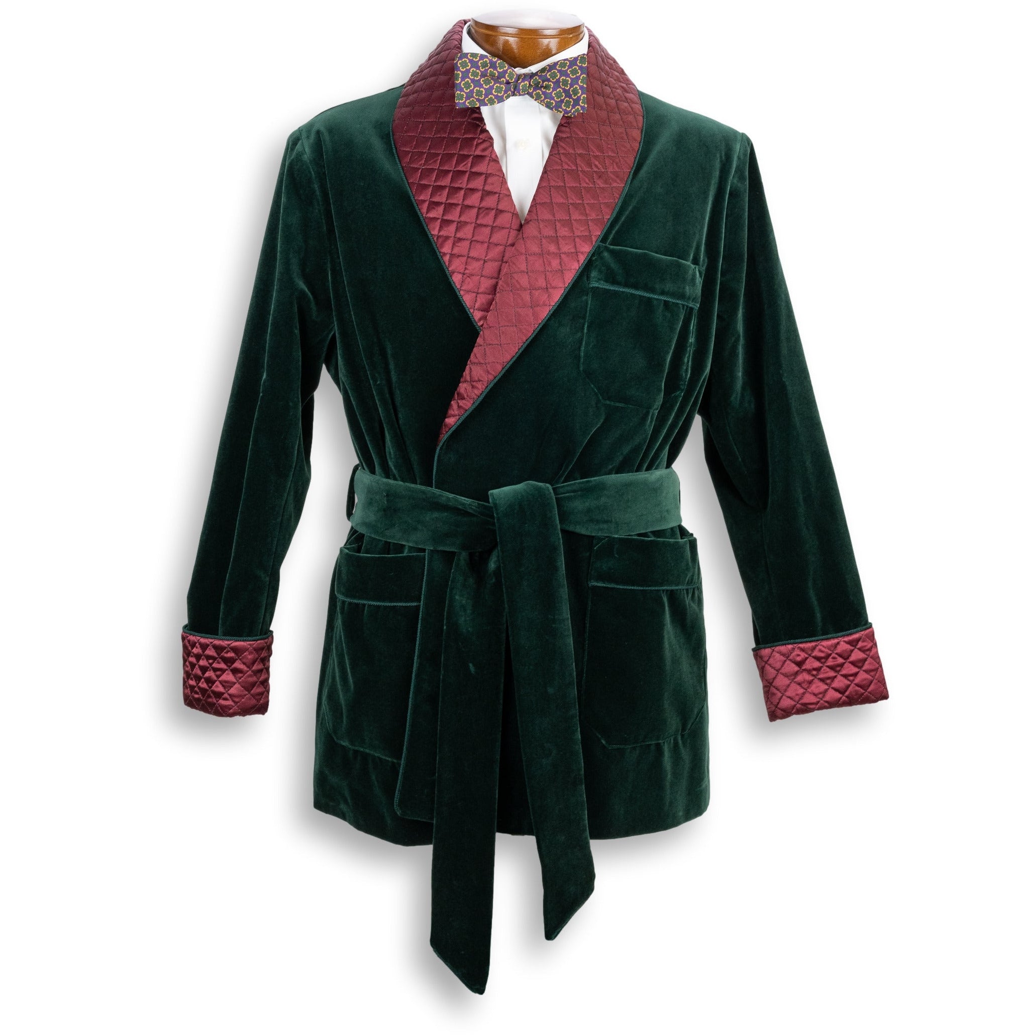 Made in Italy for The Andover Shop, this Smoking Jacket features a classic shawl collar, full bemberg lining, green twisted cord piping, silk qulted woven contrasts, left chest pocket, two hip pockets, and a belt. It is 100% Cotton Velvet.