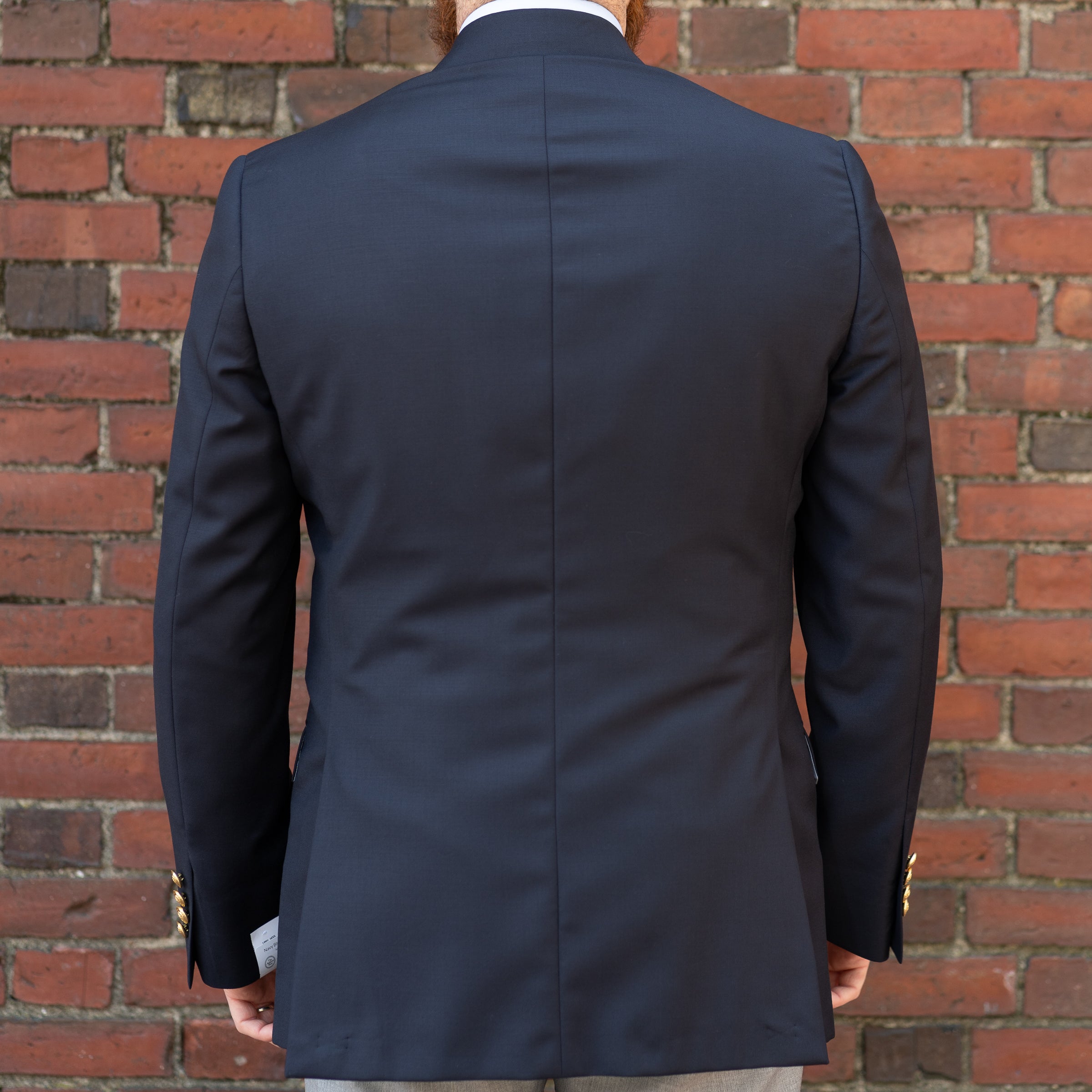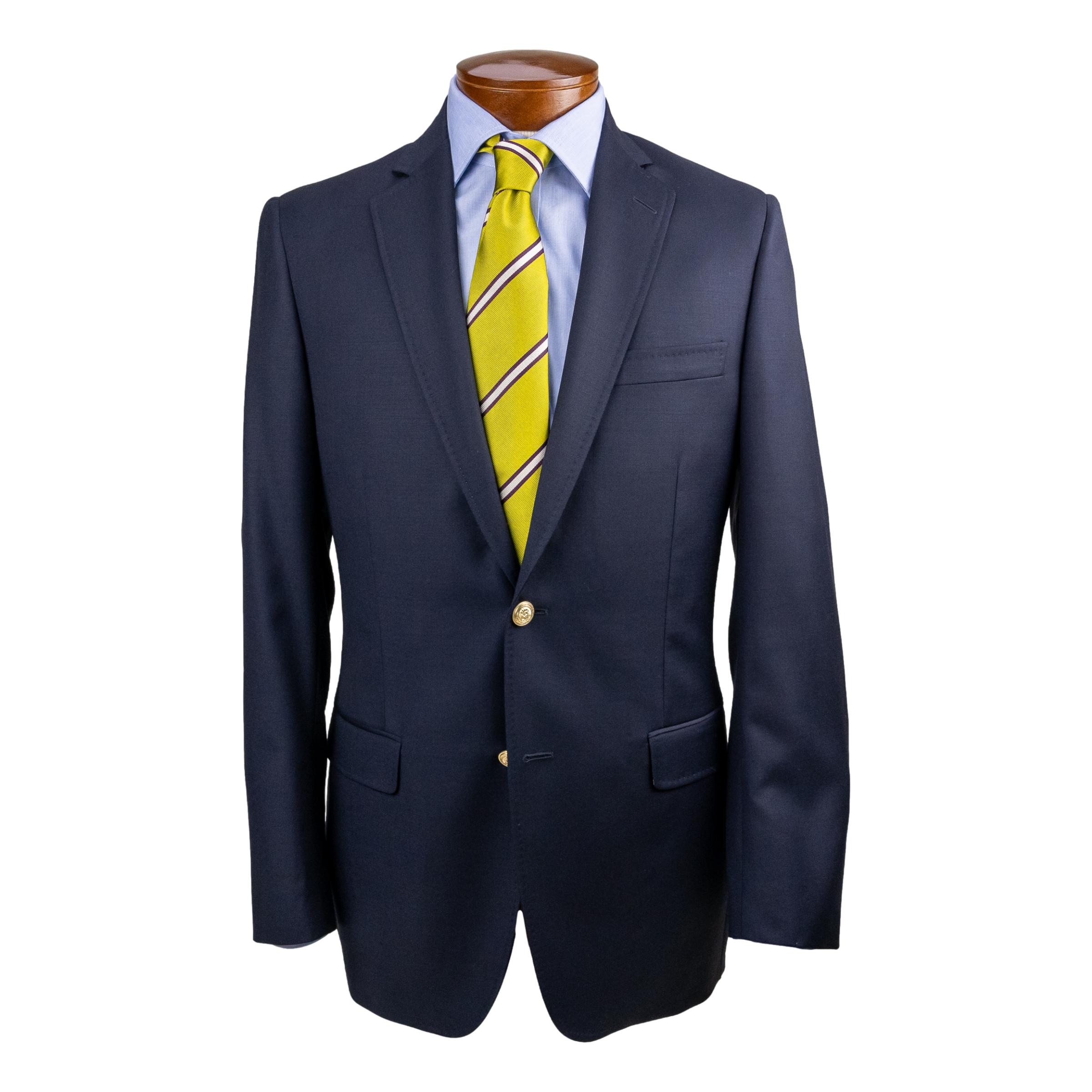 Made in the United States for The Andover Shop. 100% Wool. Characterized by its structured shoulders, notched lapels, and gold-tone buttons. The blazer has two buttons with flap pocket. The Sutton model is a slightly trimmer model than the Huber model and features side vents. The Huber model features a center vent.