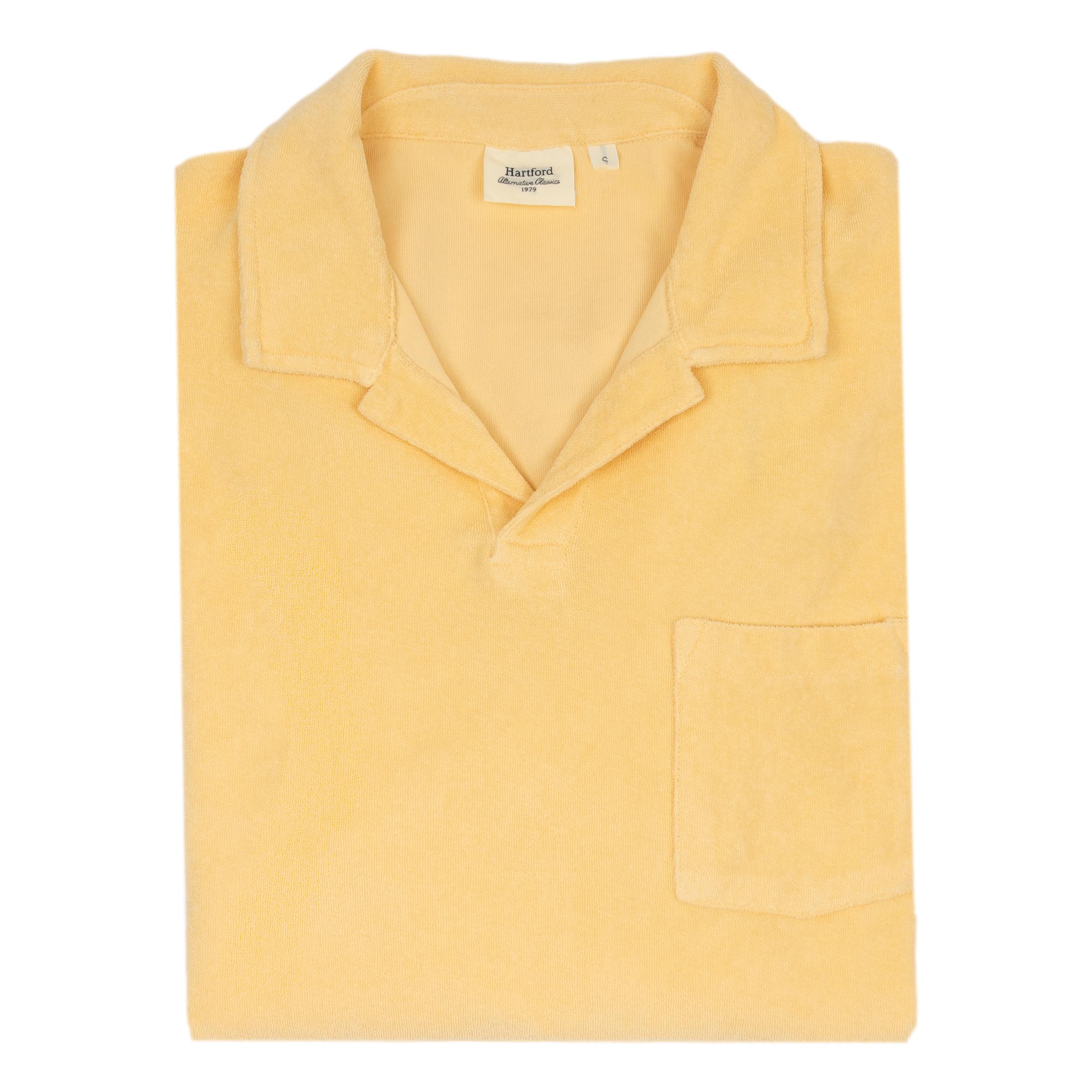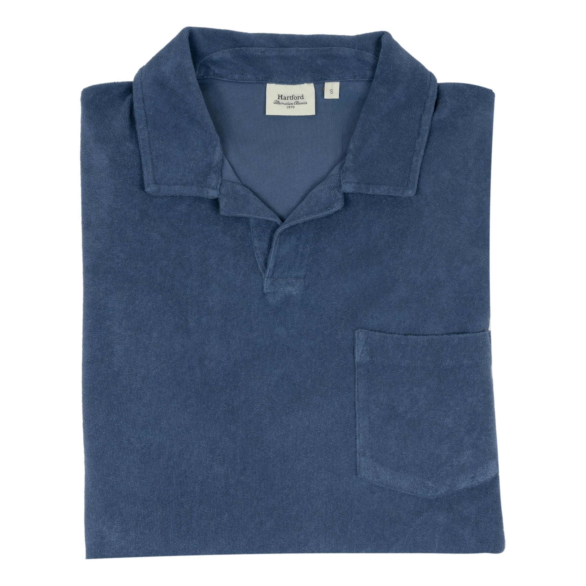 Men's terry polo with short sleeves, chest pocket and open collar. This polo is garment-dyed, giving the color a subtle, washed effect and softening the feel. A timeless revisited in a quintessential summer fabric. Terry cotton knit. Stretchy and lightweight, this fabric has a terrycloth look thanks to the little loops on the top. Made in Portugal.