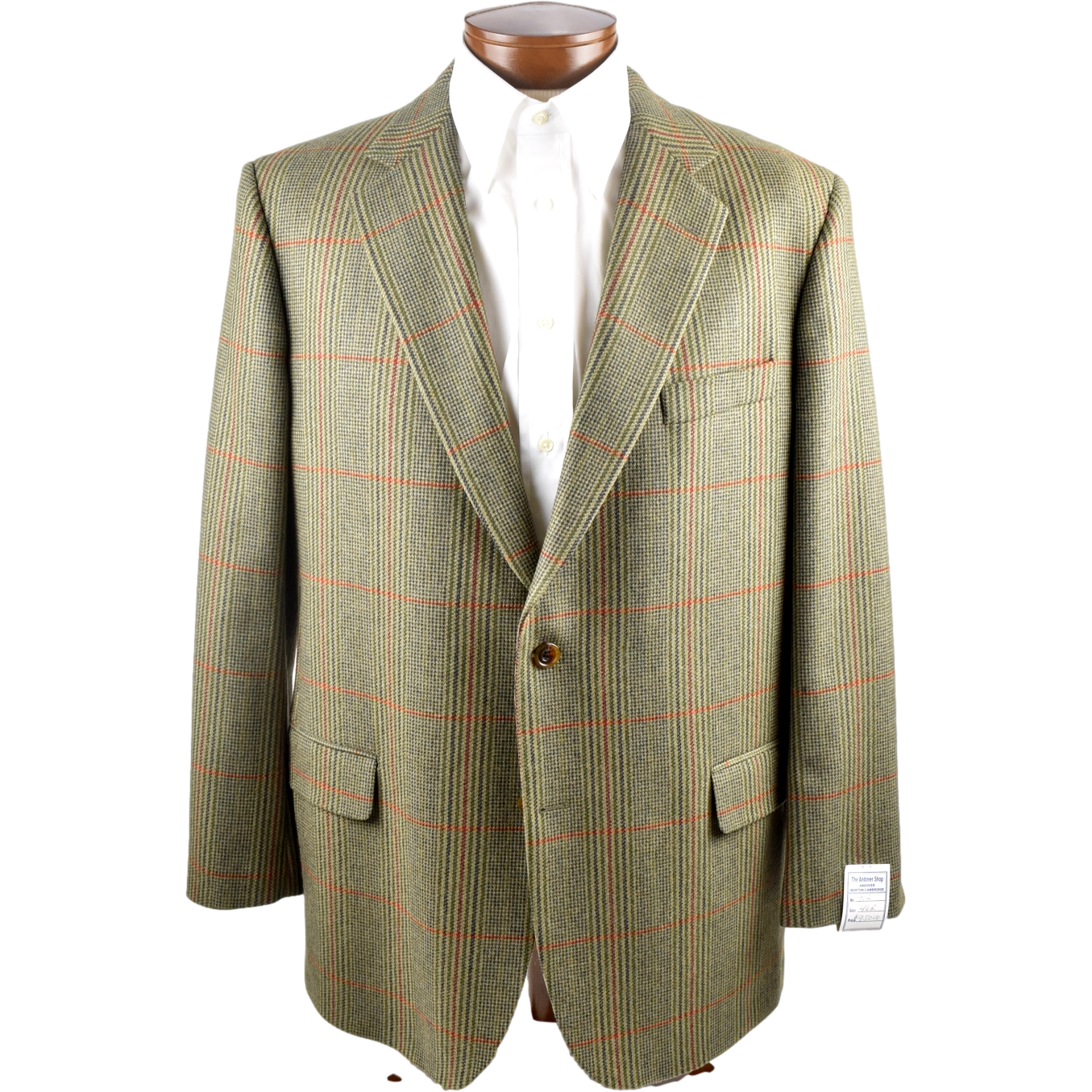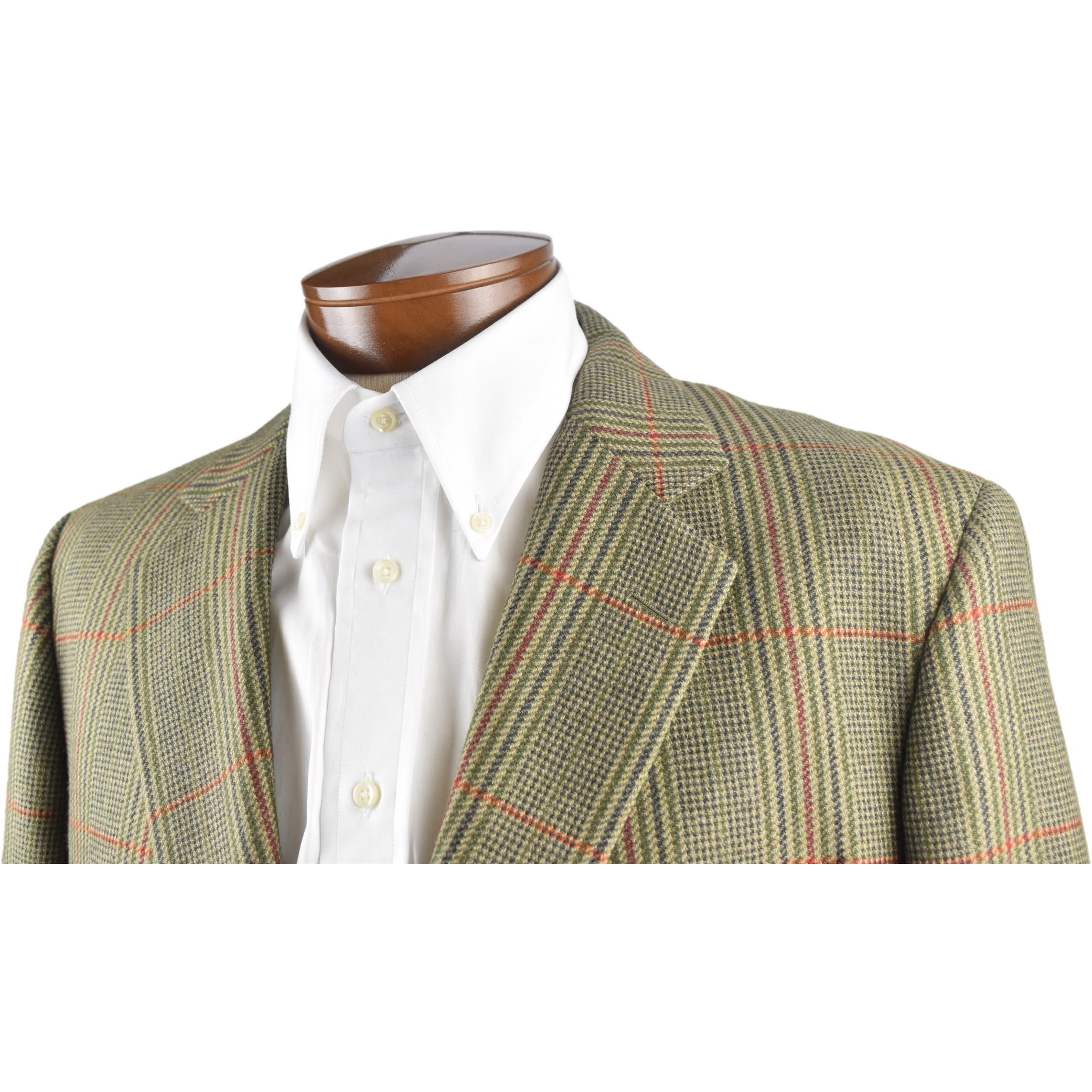 Classic olive green glen plaid with burnt orange and red windowpane. 2 button, undarted, with a center vent. 100% Wool. Made in the USA. After Special Orders are placed we will call you for sizing. Special Orders take between 4-6 weeks.