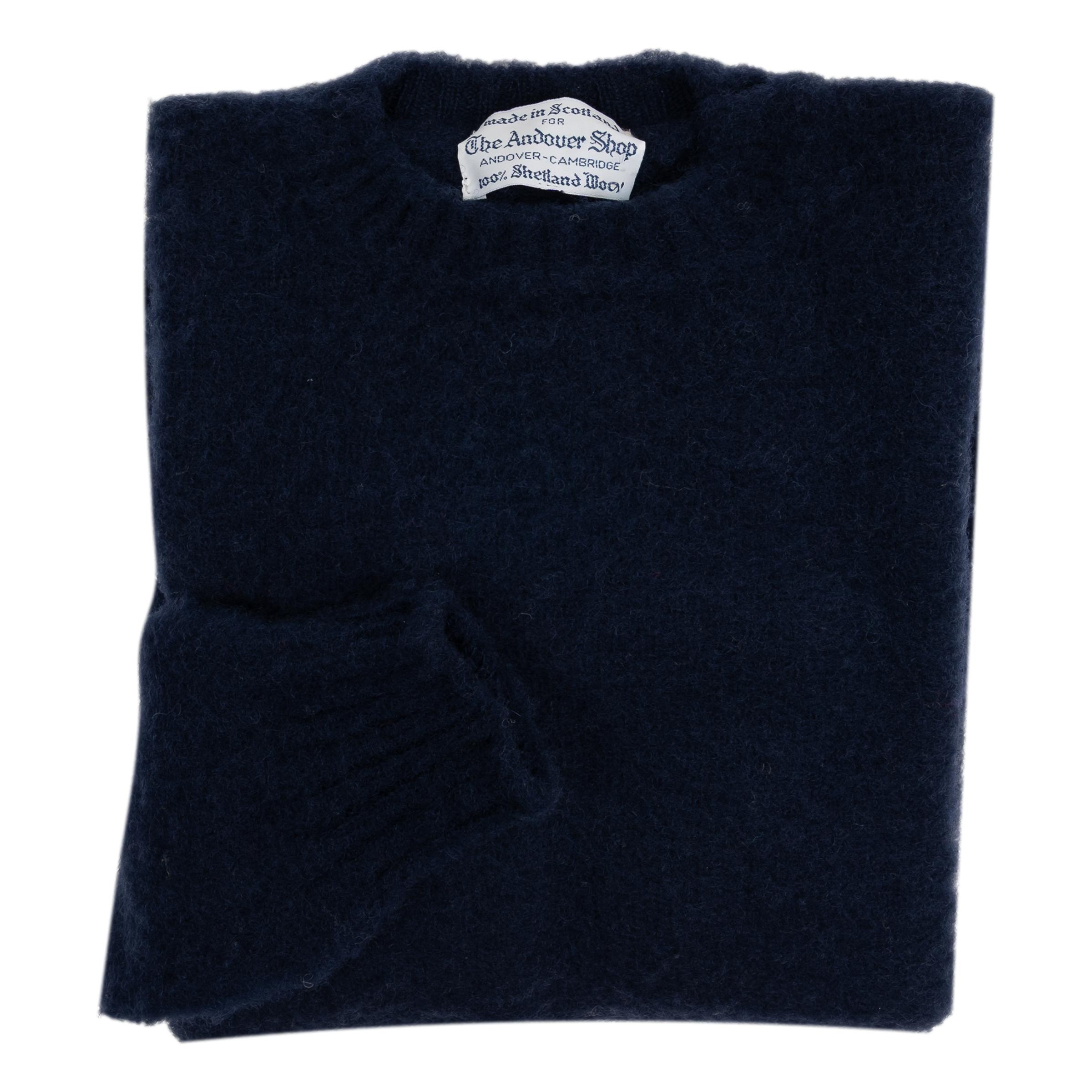 100% Pure Shetland Wool. Made in Scotland for The Andover Shop. This sweater features a ribbed collar and cuffs.