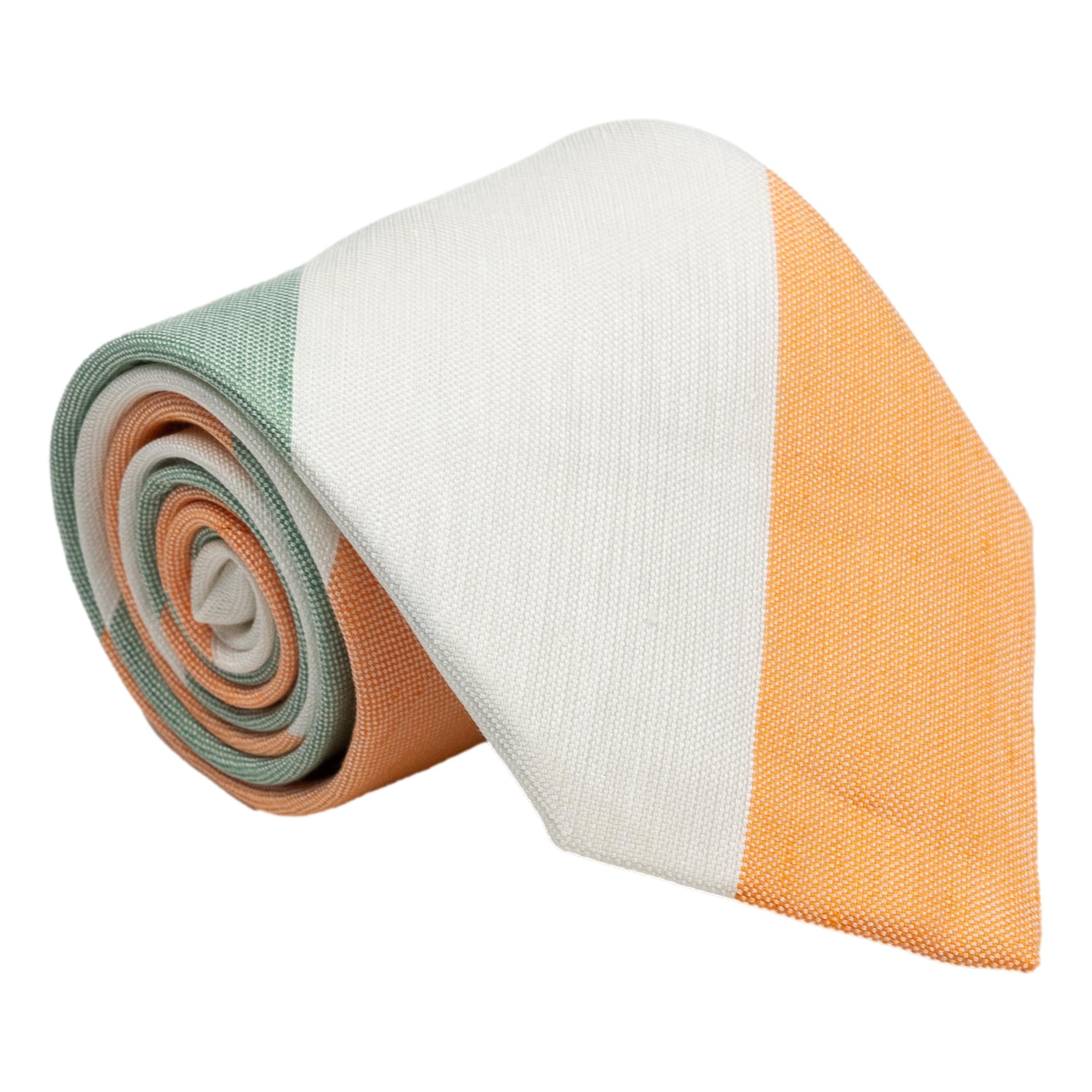 White, Light Orange, and Light Green Block Stripe Silk and Linen Tie