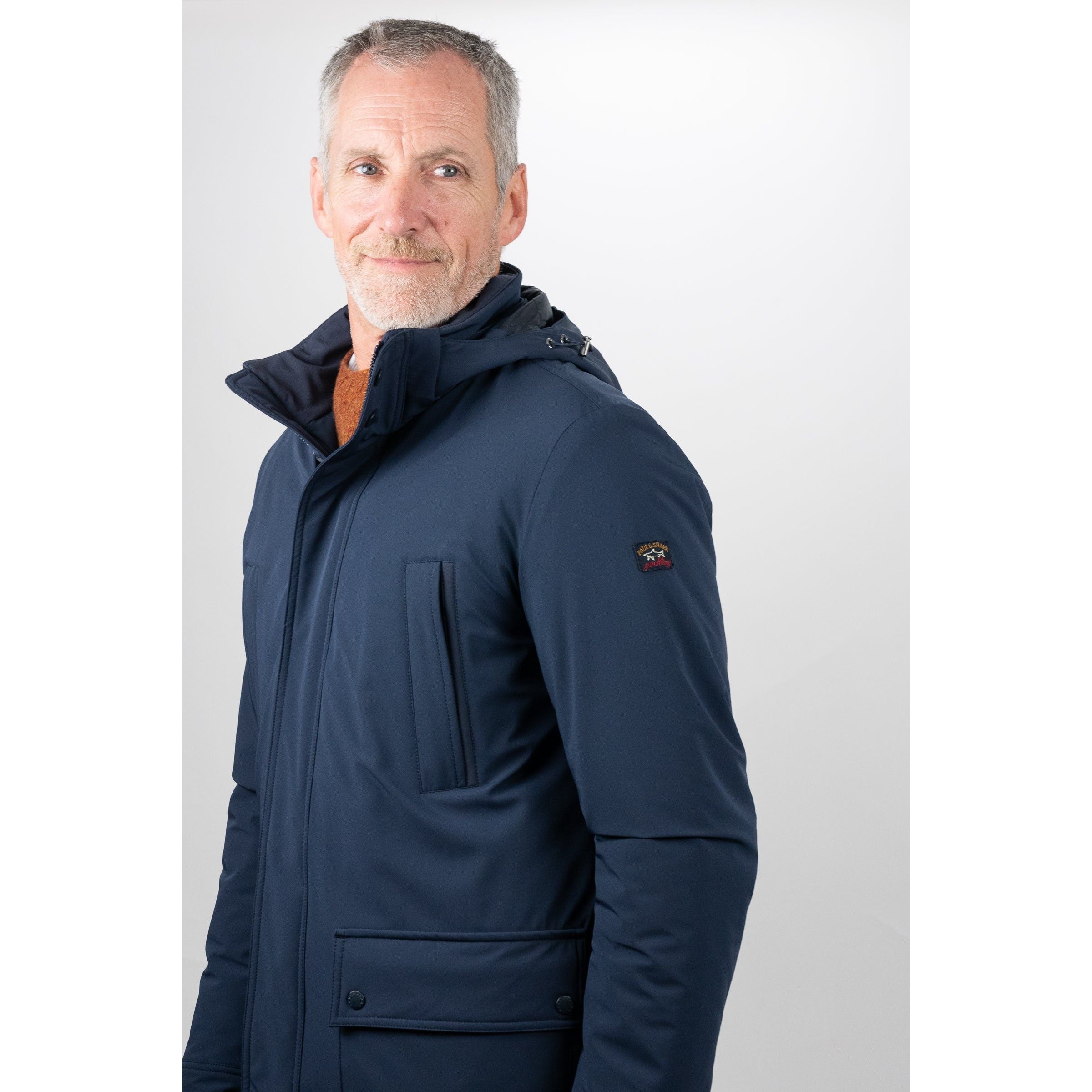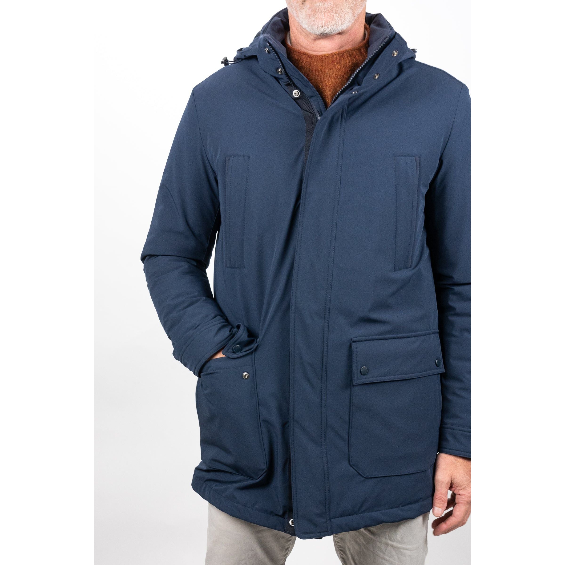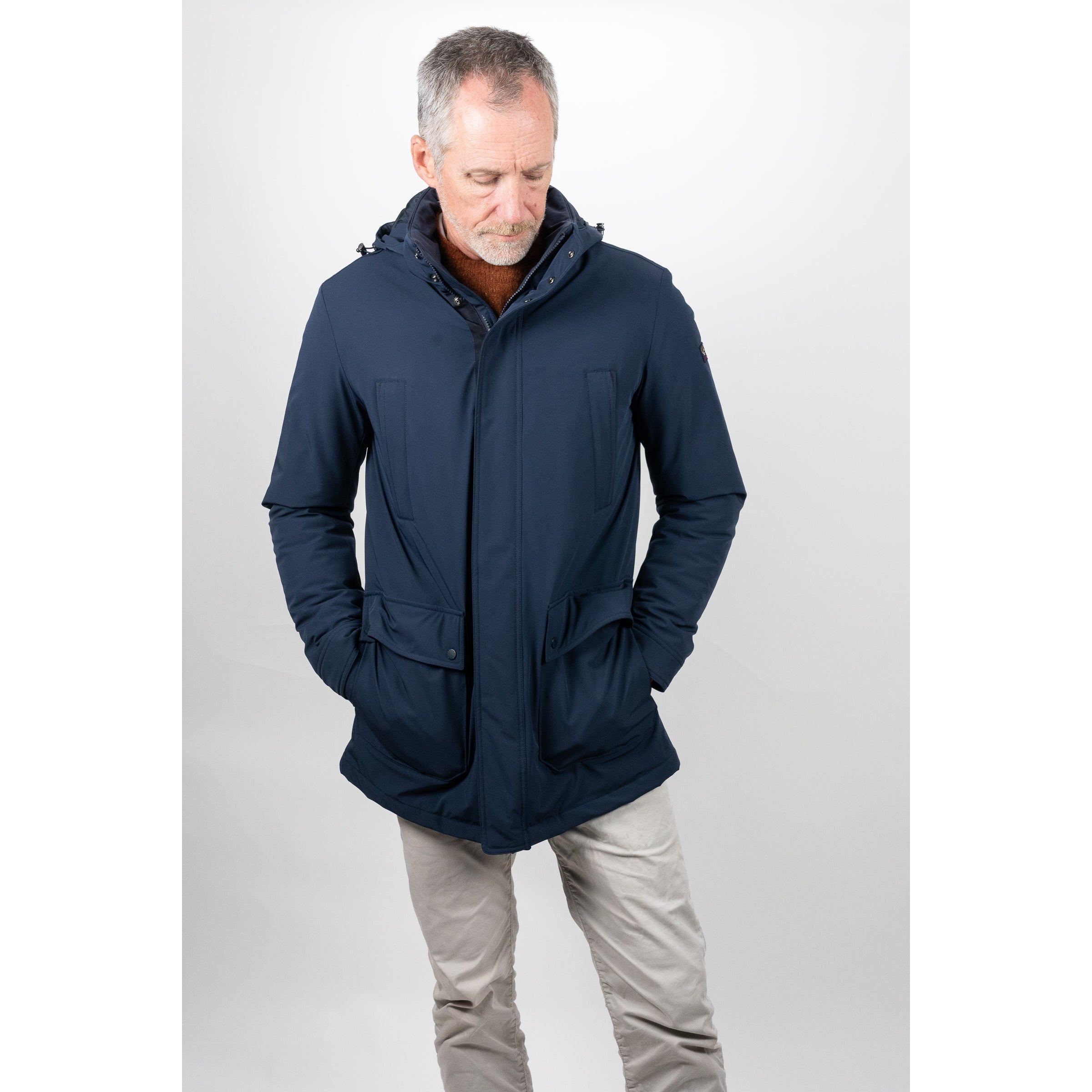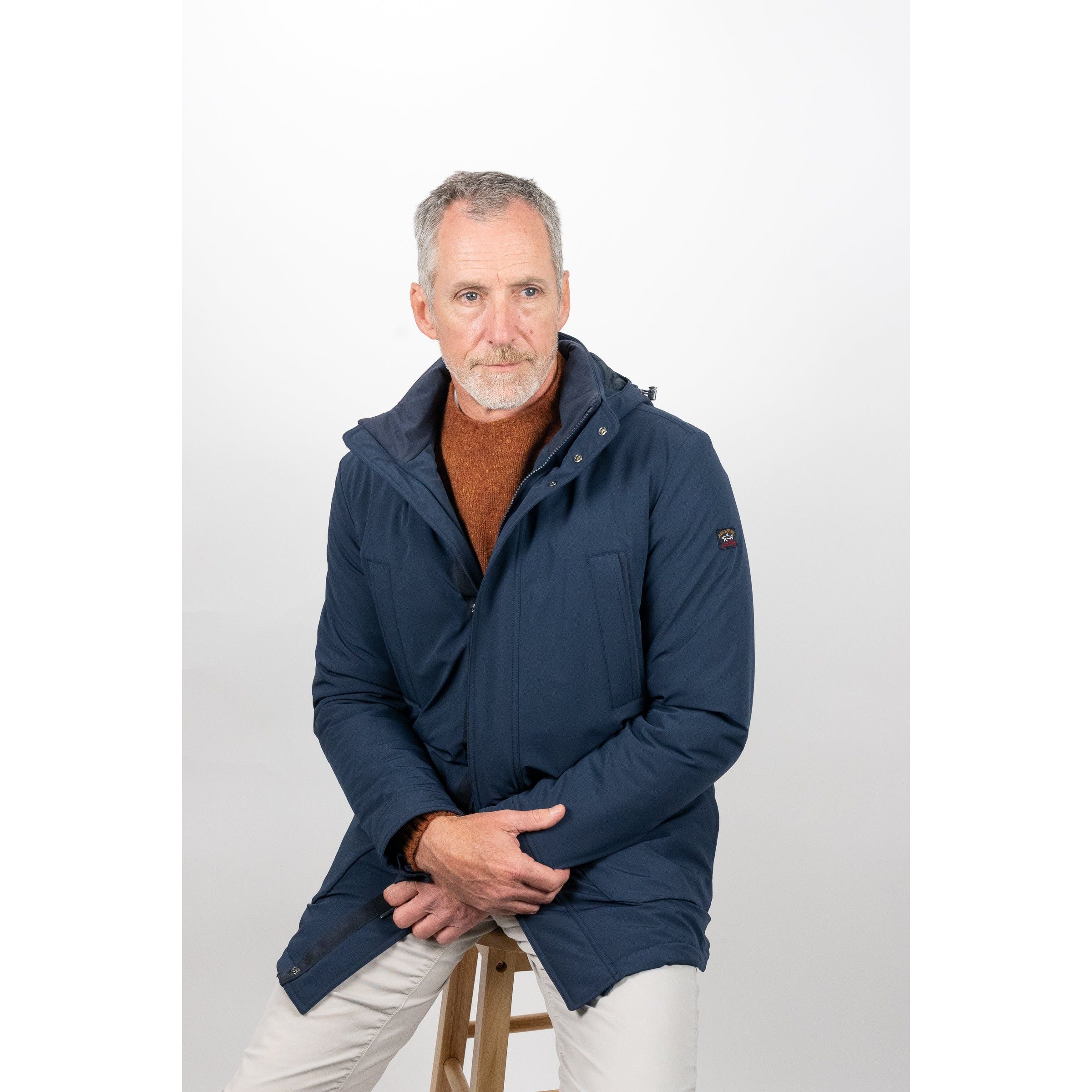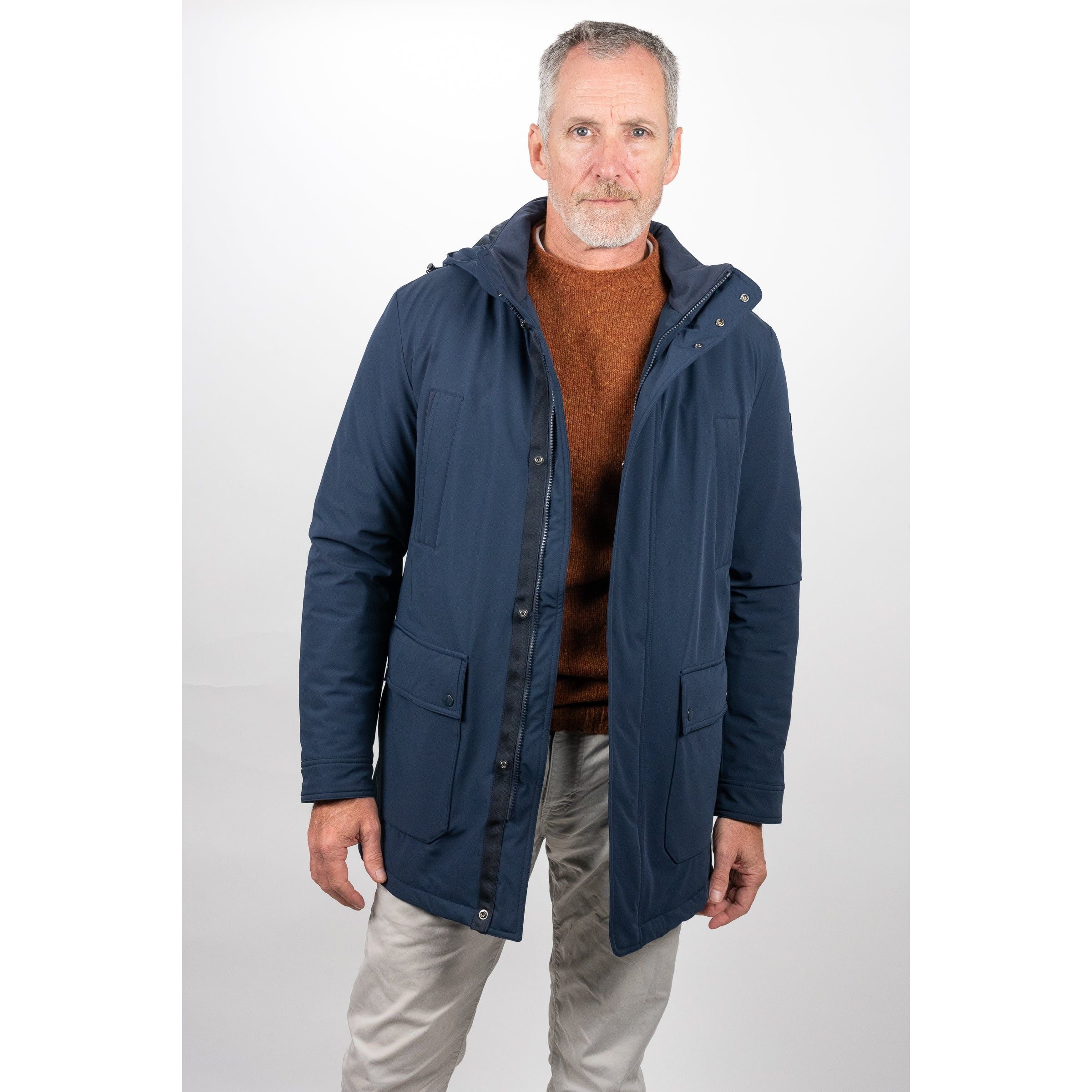 Primaloft padded jacket with detachable hood. High neck coat. Zip fastening with double slider and buttons. Two Welt Pockets. 2 hidden hand warming pockets beneath each buttoned flap pocket. Waterproof and windproof. 4 x 4 stretch material that combines performance with comfort.