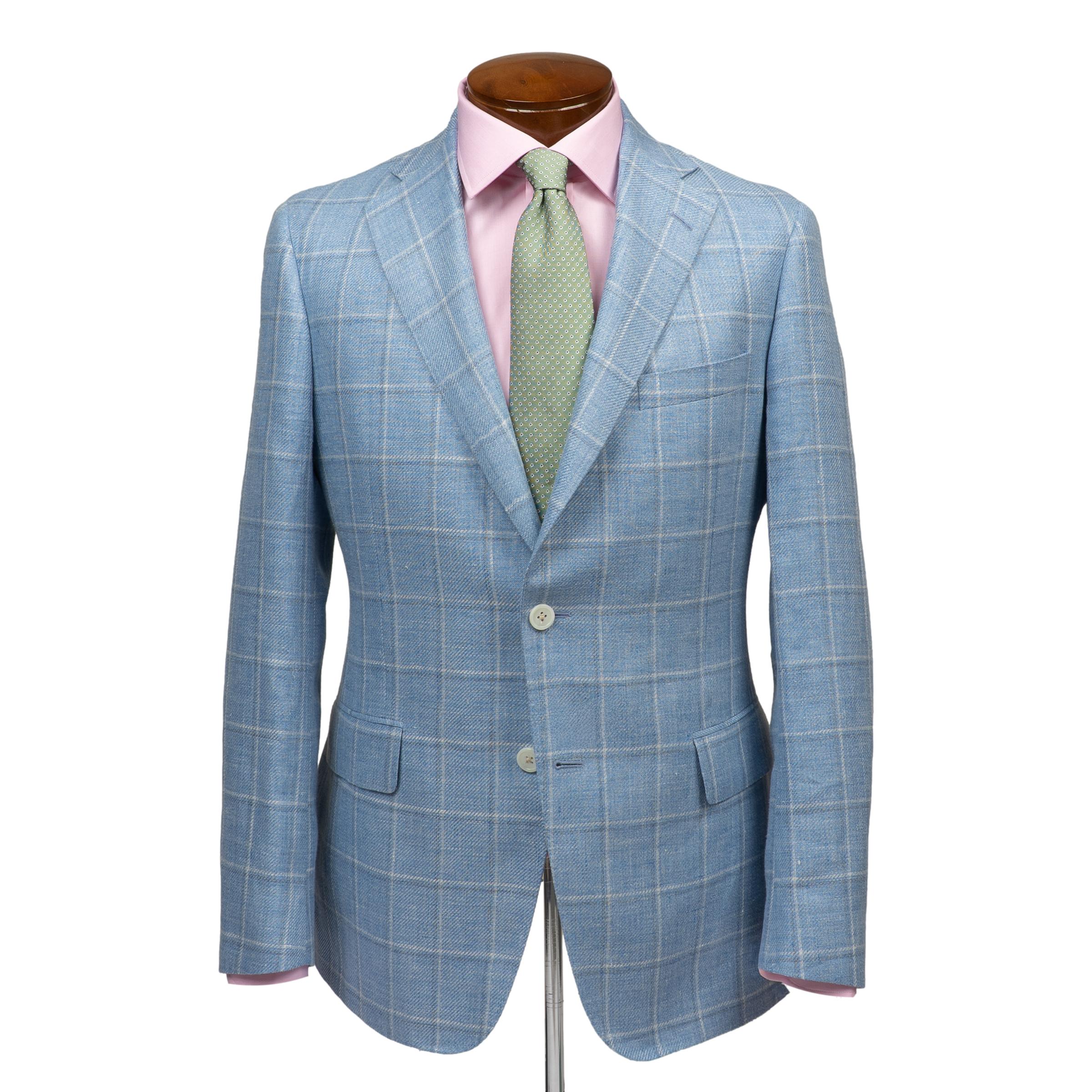 Natural and Light Blue Windowpane Wool, Silk, and Linen Sport Coat