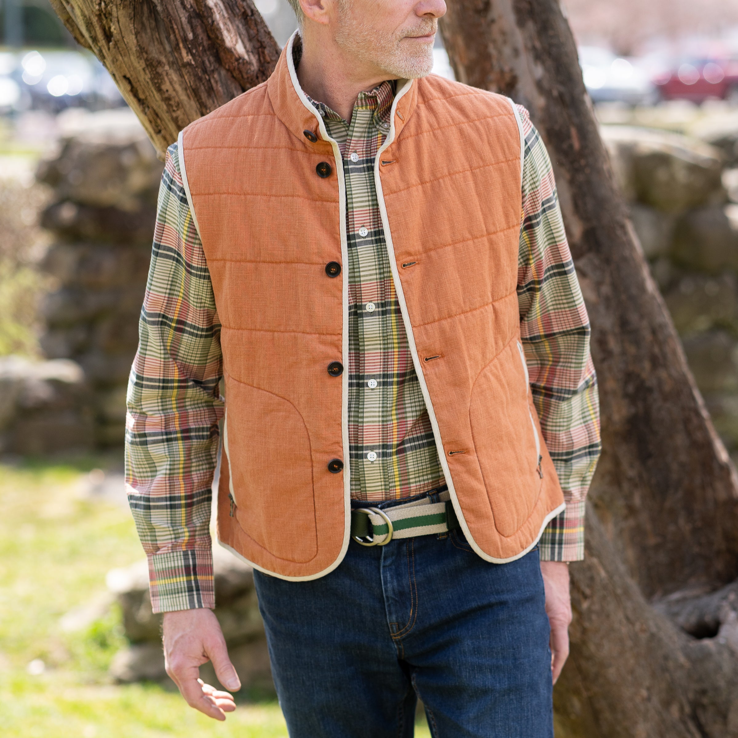 Discover the timeless charm of the Light Orange Garment Dyed Linen Waterville Vest, meticulously crafted in Italy for The Andover Shop. The front-button closure adds sophistication, making it a versatile layering piece for both casual and semi-formal occasions. Perfect for elevating your style while staying cool and comfortable. Made from premium Italian materials and hardware, it seamlessly combines style and functionality. For the perfect fit, we suggest choosing a size one up from your jacket size. Embrace Italian craftsmanship and style with the Light Orange Garment Dyed Linen Waterville Vest – where sophistication meets everyday wear.