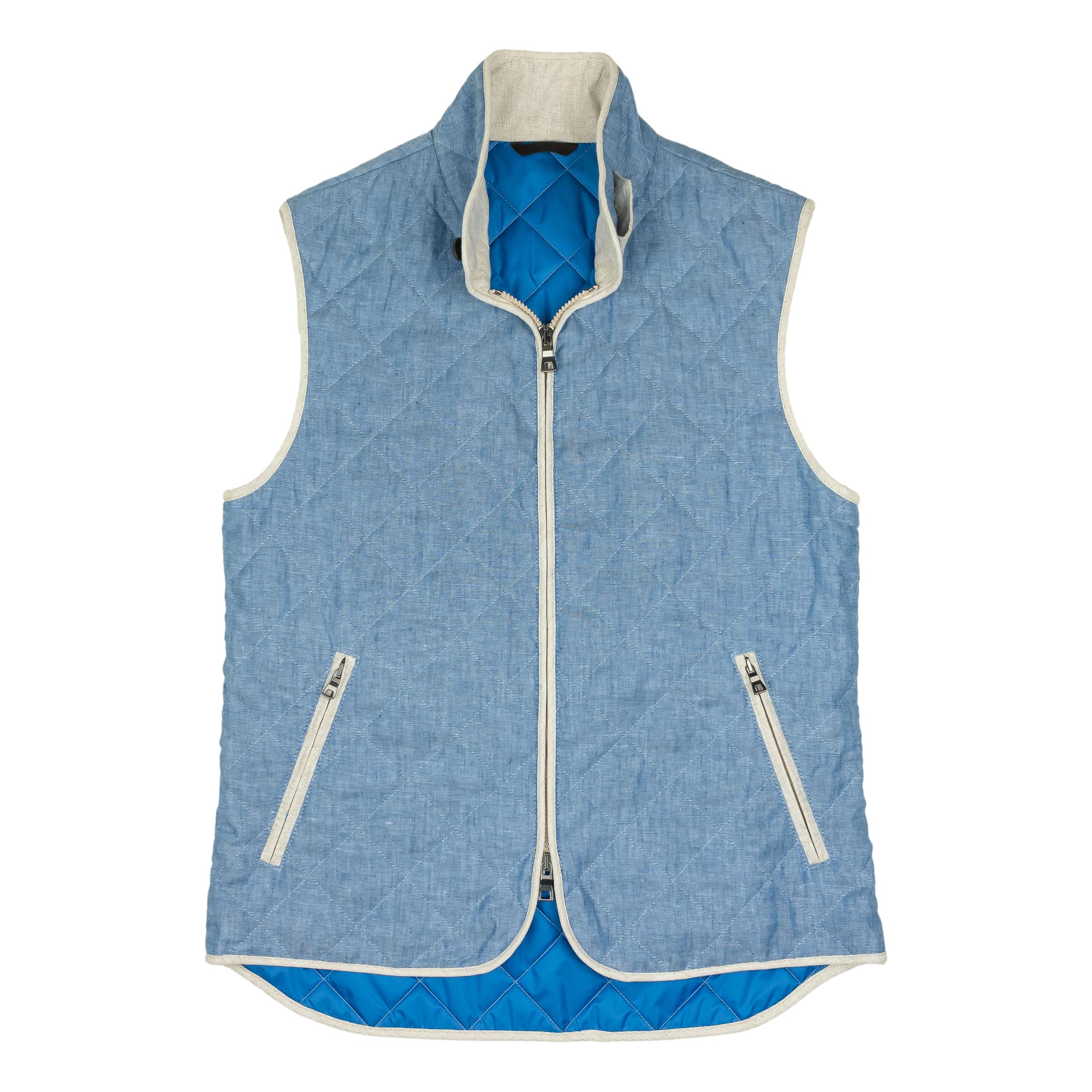 Discover the timeless charm of the Sky Blue Linen Quilted Waterville Vest, meticulously crafted in Italy for The Andover Shop. The front-button closure adds sophistication, making it a versatile layering piece for both casual and semi-formal occasions. Perfect for elevating your style while staying cool and comfortable. Made from premium Italian materials and hardware, it seamlessly combines style and functionality. For the perfect fit, we suggest choosing a size one up from your jacket size. Embrace Italian craftsmanship and style with the Sky Blue Linen Quilted Waterville Vest – where sophistication meets everyday wear.
