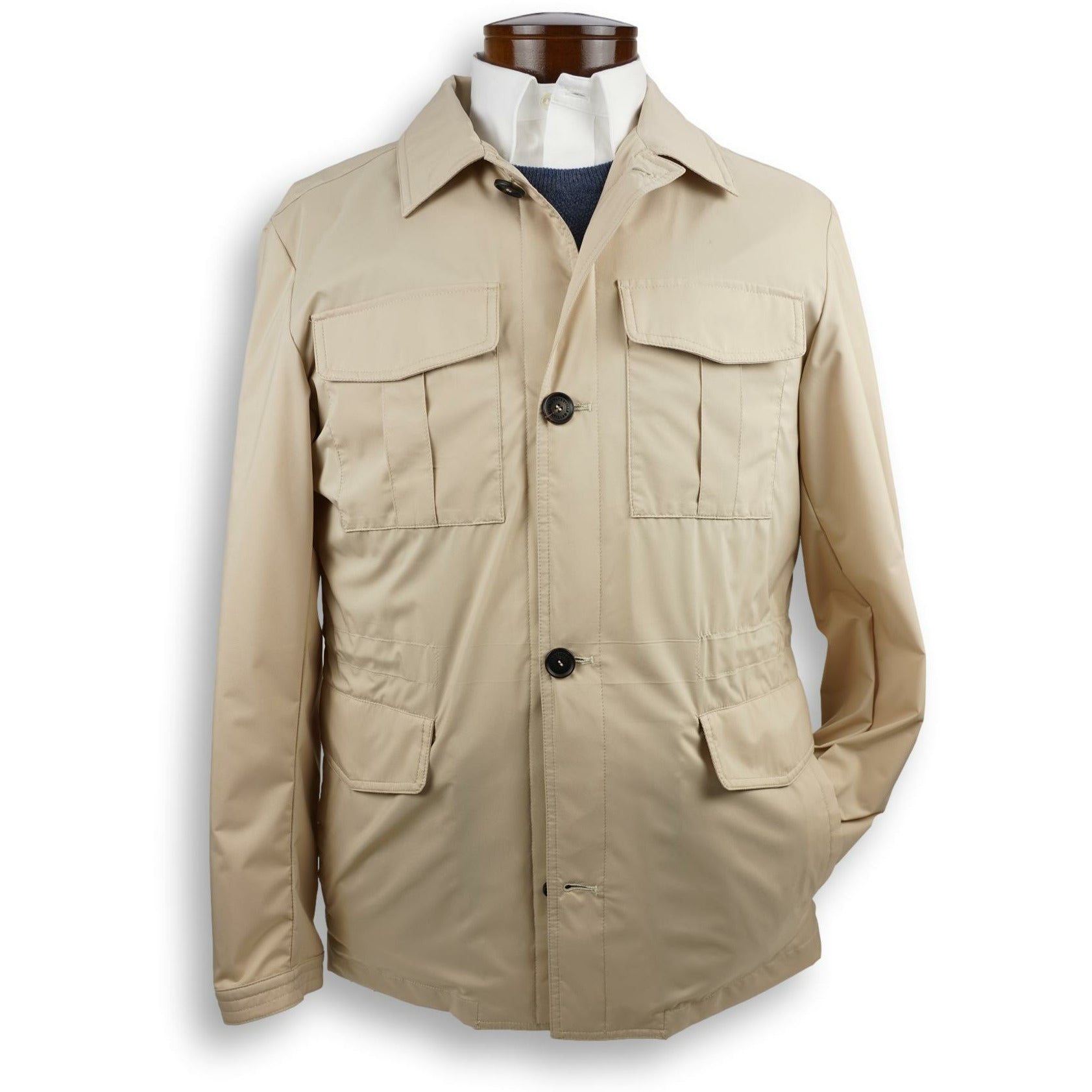 The Barry Lightweight Technical Safari Jacket is a great Spring or Summer outerwear piece. Crafted of a microfiber polyester with a linen and cotton blend lining, this Italian made jacket is the perfect outerwear piece that will last you into the summer. Perfect for the boat or a walk on the beach. The jacket features two chest pockets, two hip pockets with hidden hand pockets, and two interior pockets. It also features a waist draw string and is a button front.