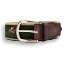 Each belt has an artist-designed signature ribbon stitched onto 100% cotton webbing and fully stitched leather tabs cut from full grain Latigo leather. Each leather tab belt is finished with solid cast brass buckles in a brushed silver finish. Proudly Made in Maine.