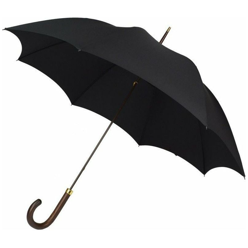 Made on a 25" Steel Fox Frame with a Gilt Tip Cup (gold color), the GT1 is available with a choice of polished hardwood handles. The length of this umbrella is approximately 36" from handle to ferrule. The canopy is made with a high grade 100% Polyester water repellent black fabric, which when opened is approximately 41" in diameter.