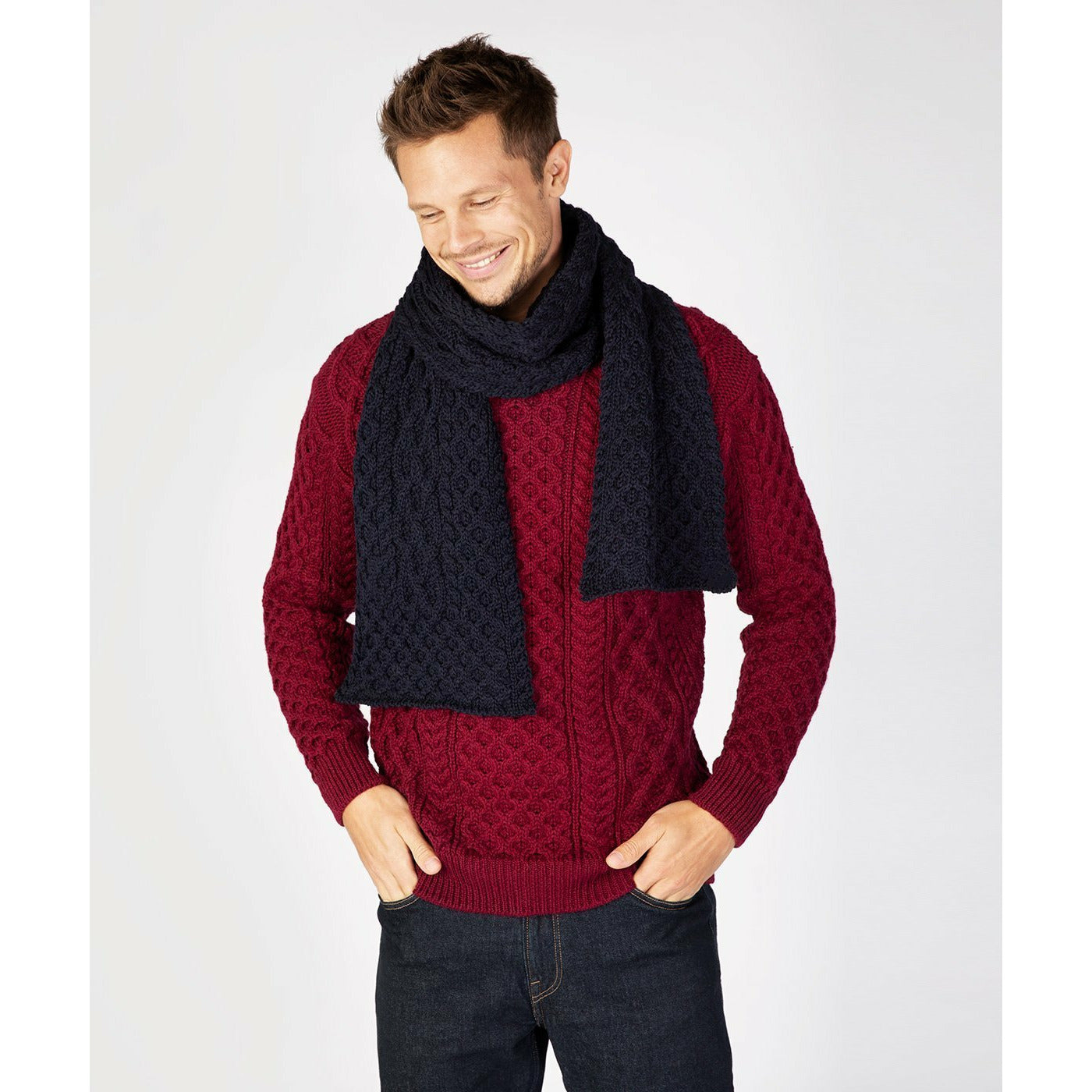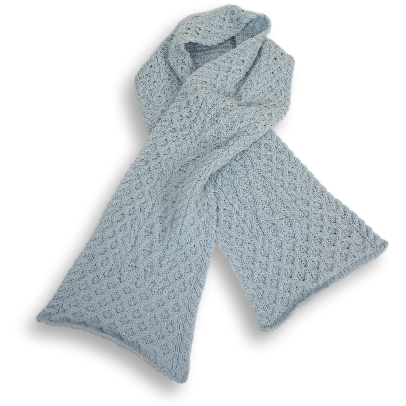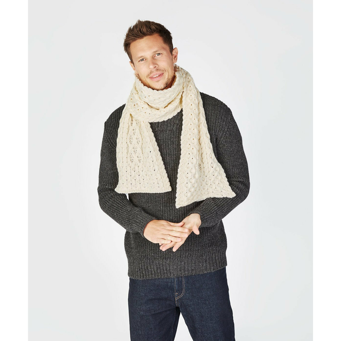 A 100% Merino wool natural coloured scarf knitted with tradition Aran stitches of honeycomb, lattice and cables to keep you warm. Natural is the original light cream colour for Arans, commonly known as 'báinín' or 'white'. 23 cm x 180 cm. Match it with the knitted Aran Hat! Unisex.