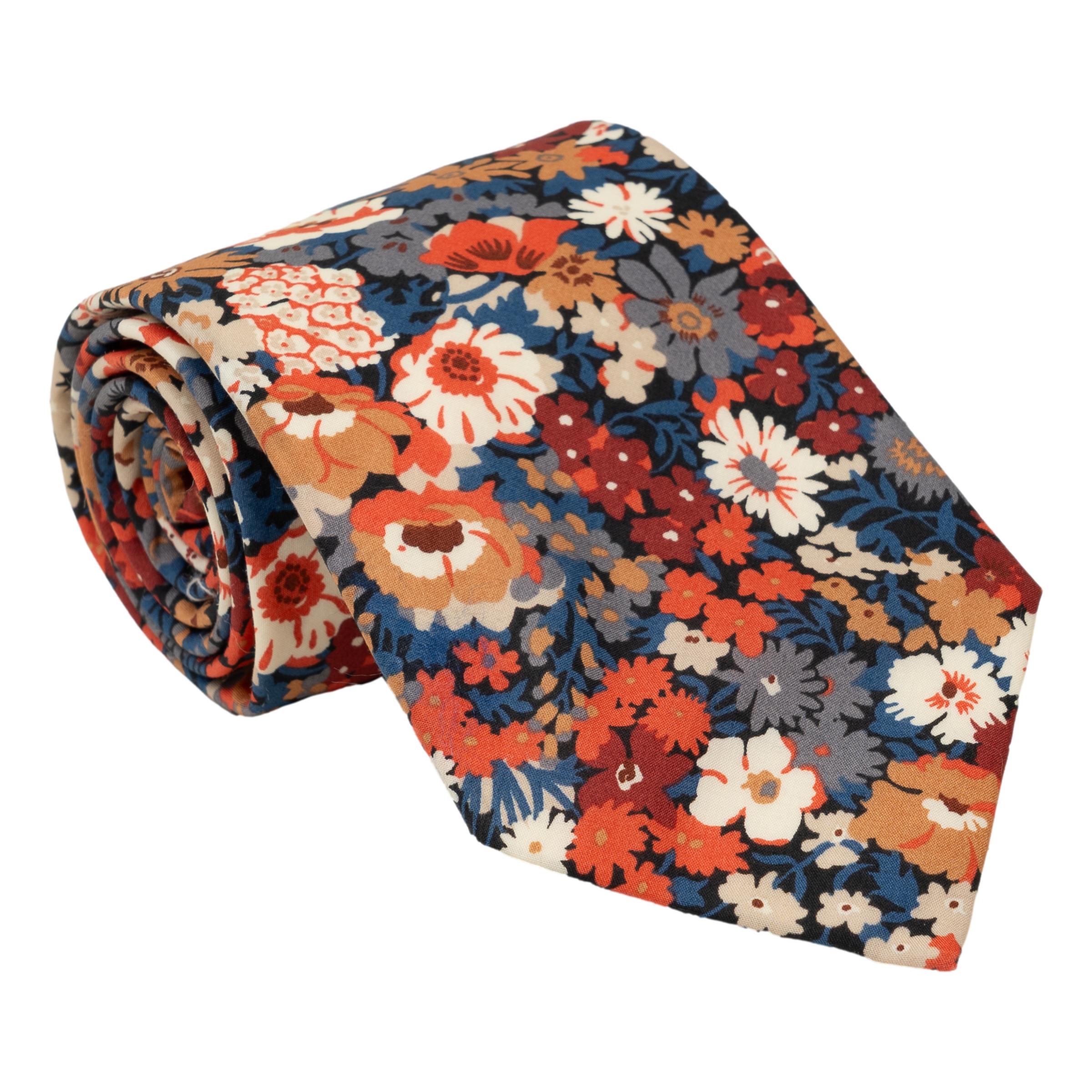 Tuscan yellow, lapis and saffron spring flowers on a off white ground. Handmade from the finest Liberty of London Tana Lawn Cotton. Made in the USA. To inquire about using this tie for a wedding please call one of our store locations. Please allow a lead time of about 2-4 weeks for delivery for large orders.