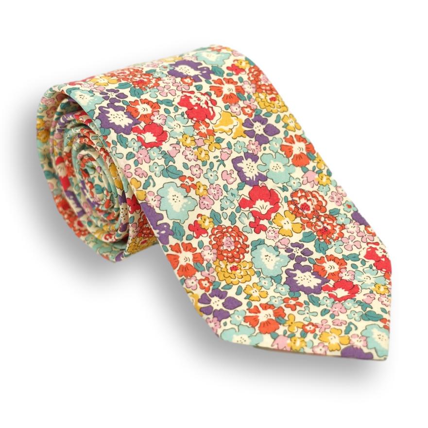 Florals in red, pink, purple, and blues on a white ground. To inquire about using this tie for a wedding please call one of our store locations. Please allow a lead time of about 2-4 weeks for delivery for large orders.